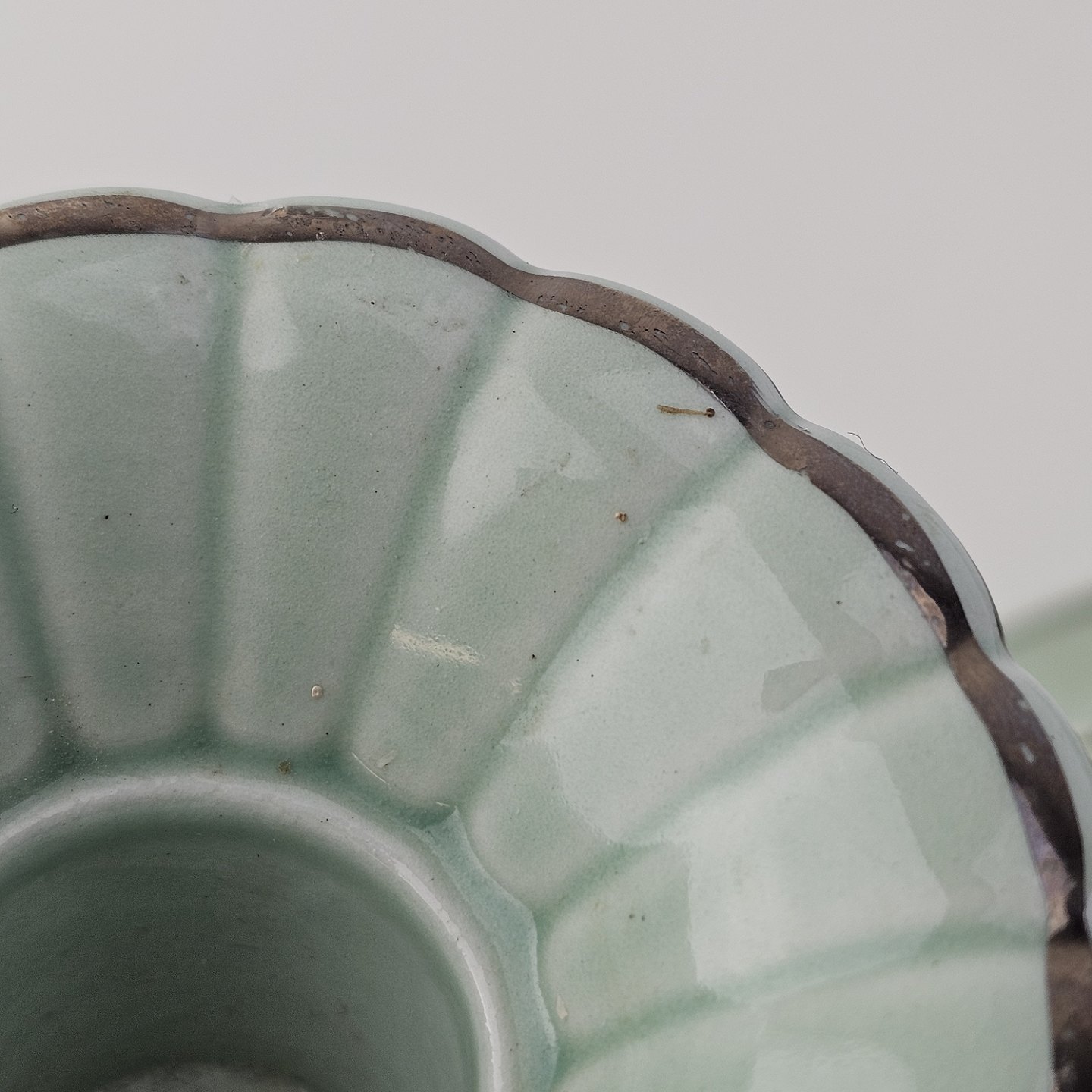 Stel i lysegrøn fajance med natur dekoration og flettet kant