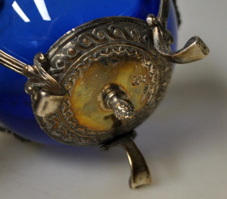 Silver sugar bowl with blue glass insert, 19th century.