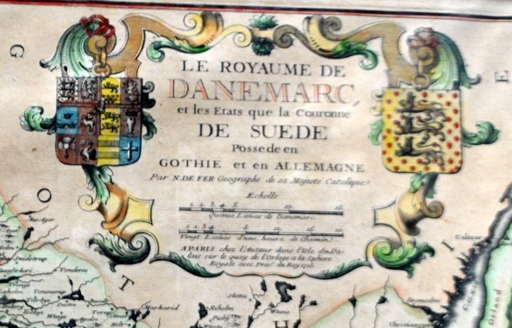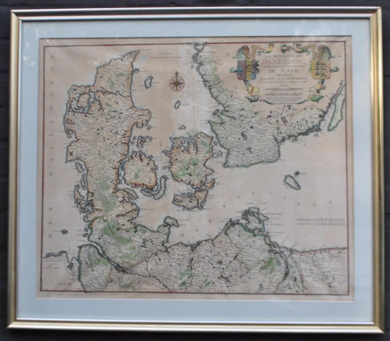 Nicolas de Fèr (1646 - 1720) France: General map of Denmark. "The Kingdom of Denmark and the States which the Conronne of Sweden possesses in Gothia and Germany. Paris 1713. Hand-colored copper engraving. 49 x 59 cm.
