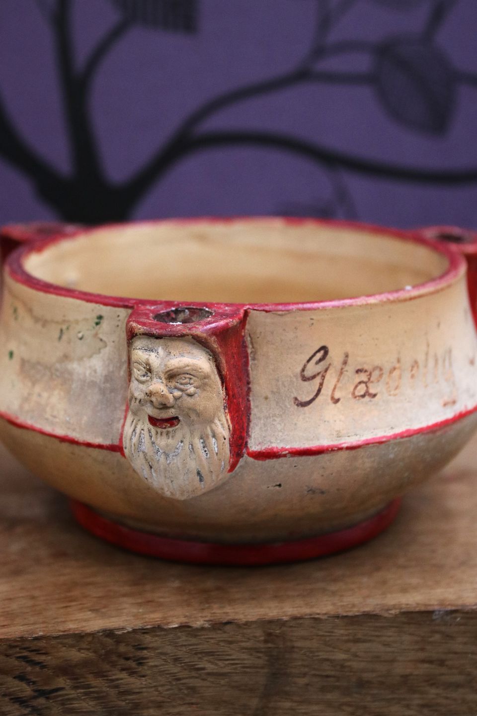 Nice, old Christmas bowl in terracotta decorated with 3 small elf heads where there is room for 3 small Christmas candles.
