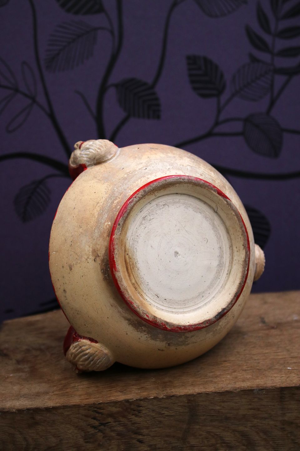 Old Christmas bowl in terracotta decorated with 3 small elf heads where there is room for small Christmas candles.