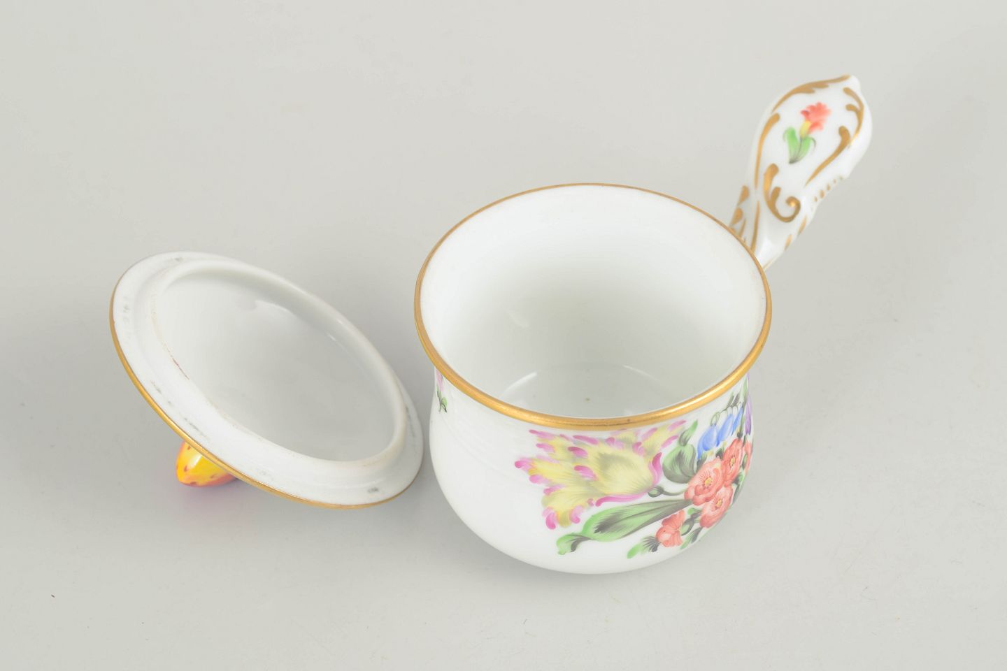Hand-painted bouillon cup in glazed porcelain with floral decoration in pink, purple, blue and green tones. Rounded body with a gently curved handle, lid with bud-shaped finial, and subtle gilt detailing along the rim and accents.