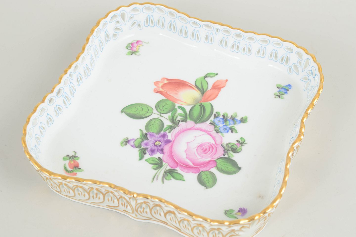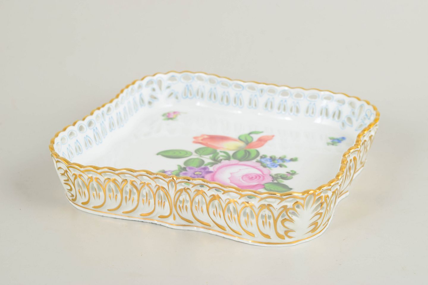 Hand-painted serving dish in glazed porcelain with a floral motif in pink, green and blue tones. Square form with a scalloped, moulded rim and rich gilt decoration around the edge.