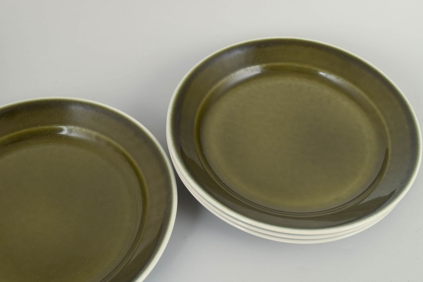Set of four dinner plates in glazed stoneware from the "Vardag" series. The plates feature a simple, functional design with a wide rim and deep centre, finished in a characteristic green glaze with dark edging, typical of Stig Lindberg’s everyday tableware from the 1970s.