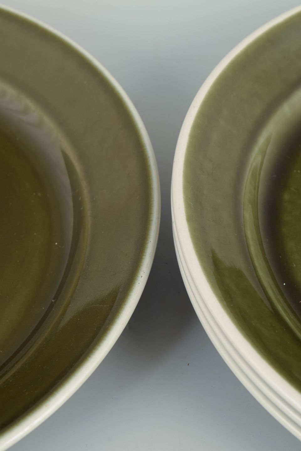 Set of four dinner plates in glazed stoneware from the "Vardag" series. The plates feature a simple, functional design with a wide rim and deep centre, finished in a characteristic green glaze with dark edging, typical of Stig Lindberg’s everyday tableware from the 1970s.