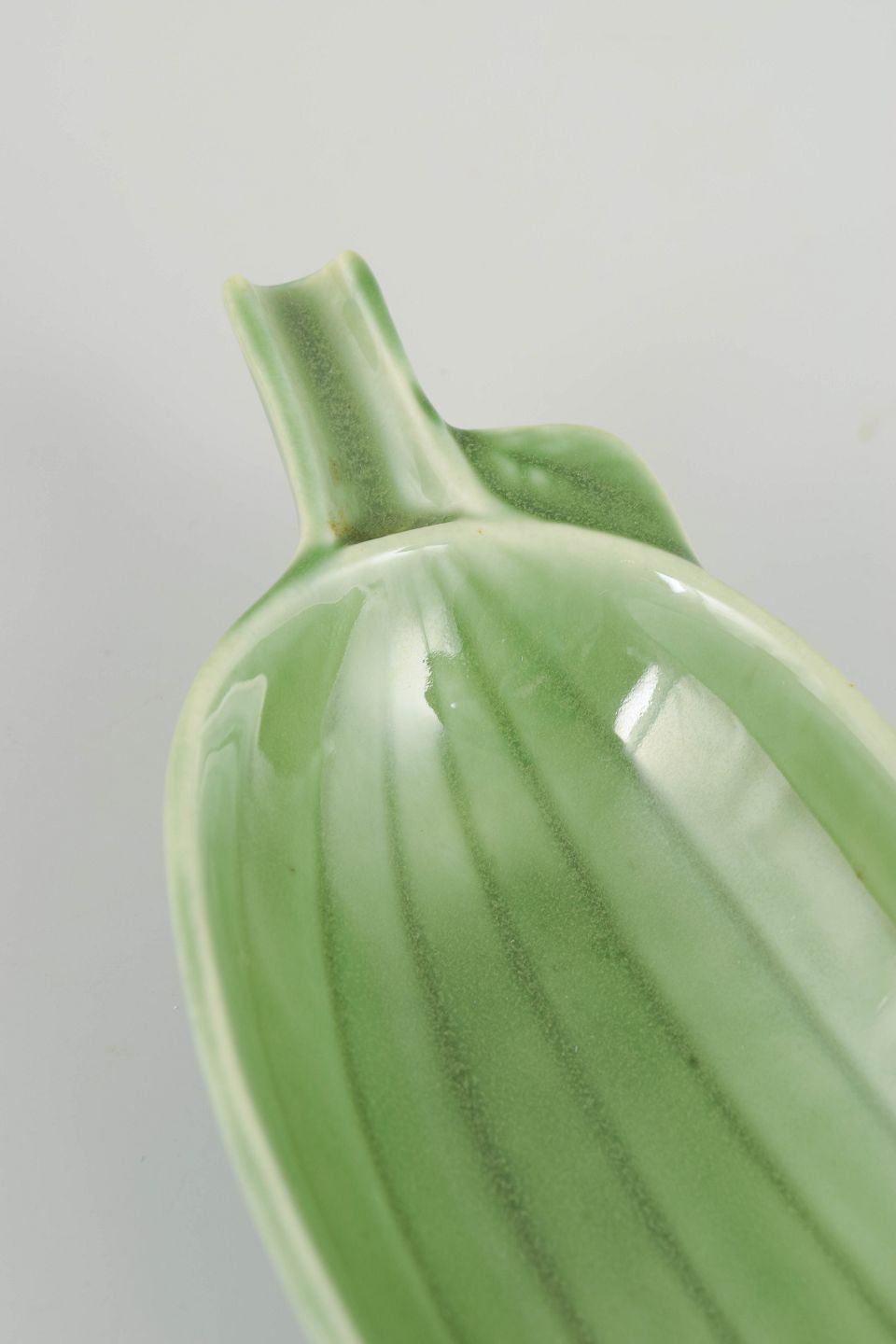 Elongated, naturalistically shaped faience dish modelled as a cucumber, with pronounced ribbing and a glossy green glaze in subtly varied tones. A distinctive and playful design from Stig Lindberg’s later production at Gustavsberg, produced in the 1970s. The model is known as “Cucumber”.