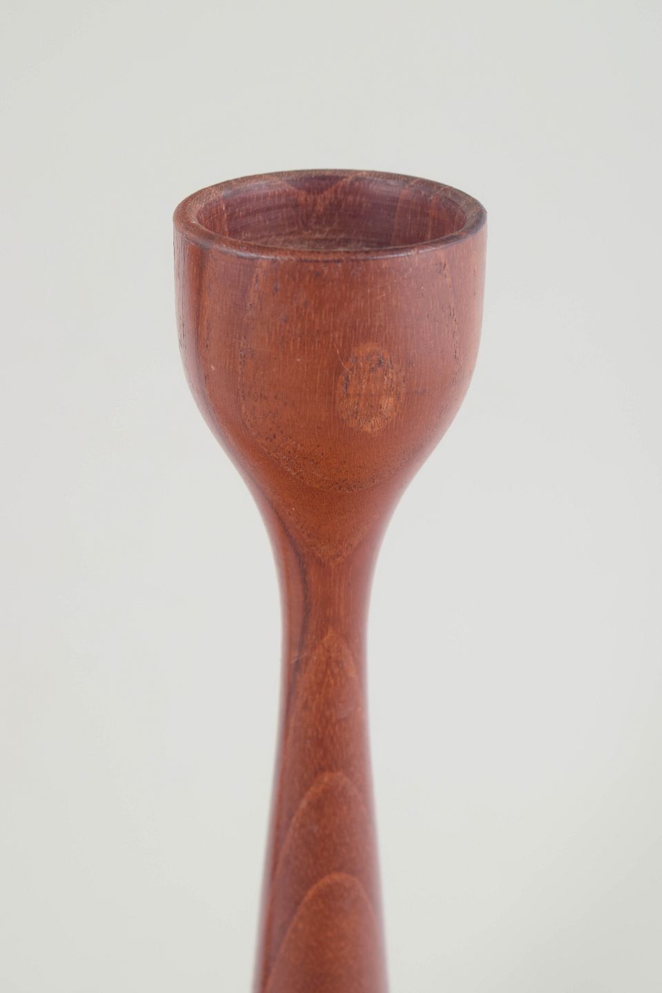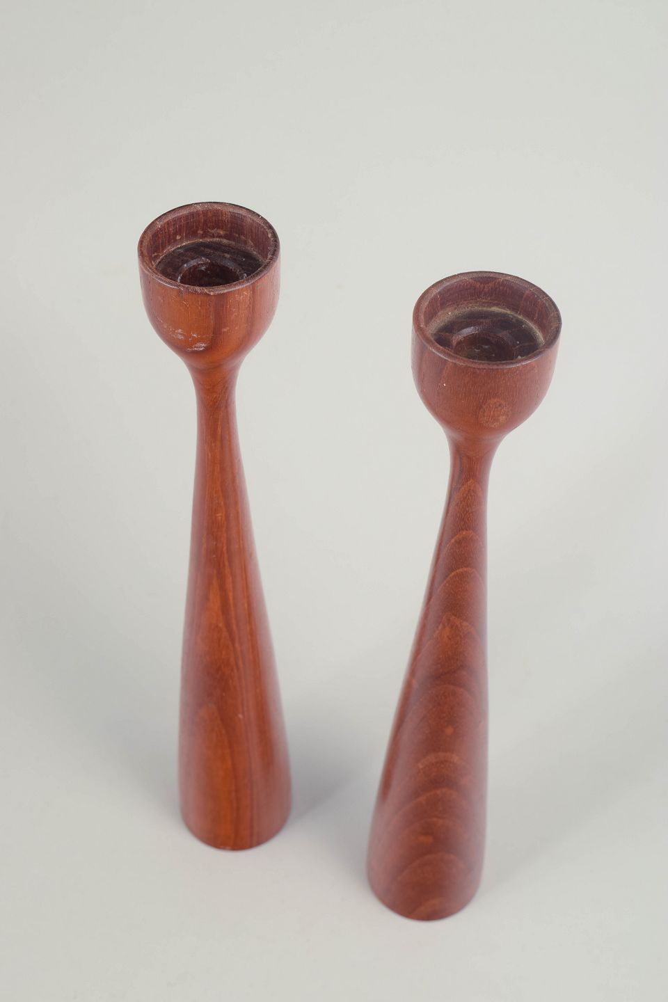 Pair of elegant, slender candlesticks in turned solid wood with a gently tapered form and subtly widened top. The restrained modernist design highlights the natural grain of the wood and reflects classic Danish design values.