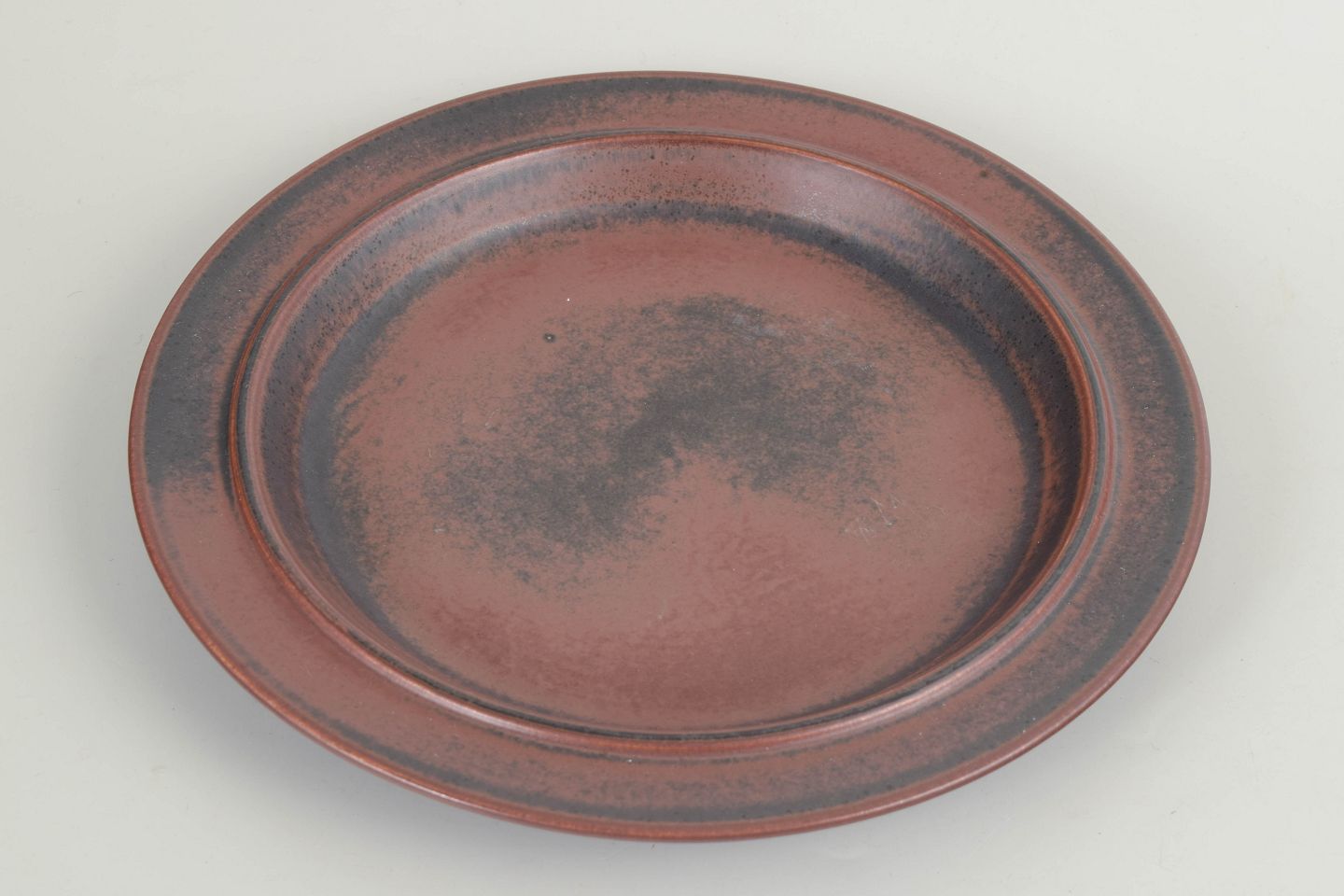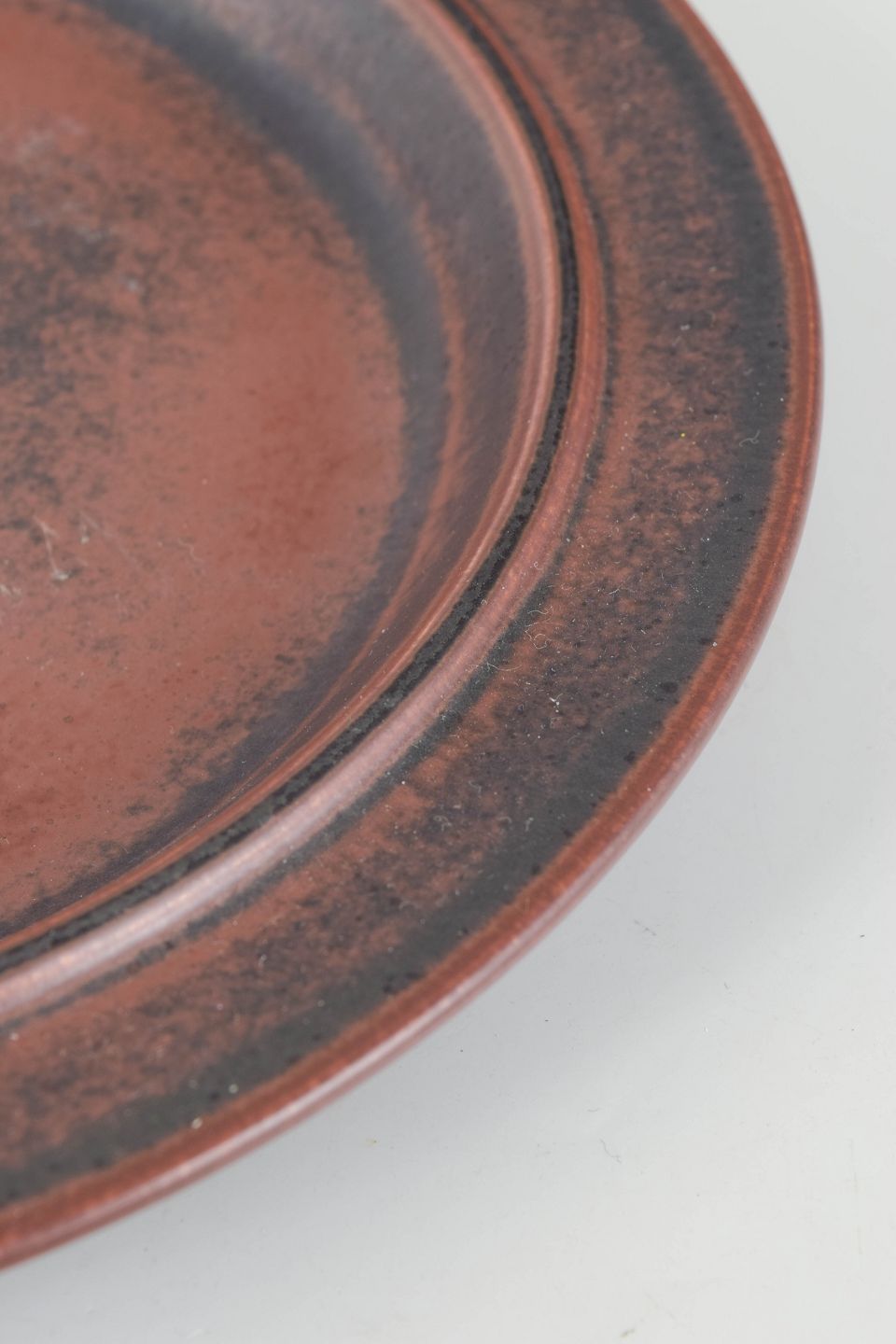 Flat stoneware dish by Arabia from the Ruska series, finished in the distinctive mottled brown glaze in warm earth tones. Classic circular form with a gently raised rim and a lively glaze surface, where natural variations give each piece an individual appearance. Model from the Ruska series.