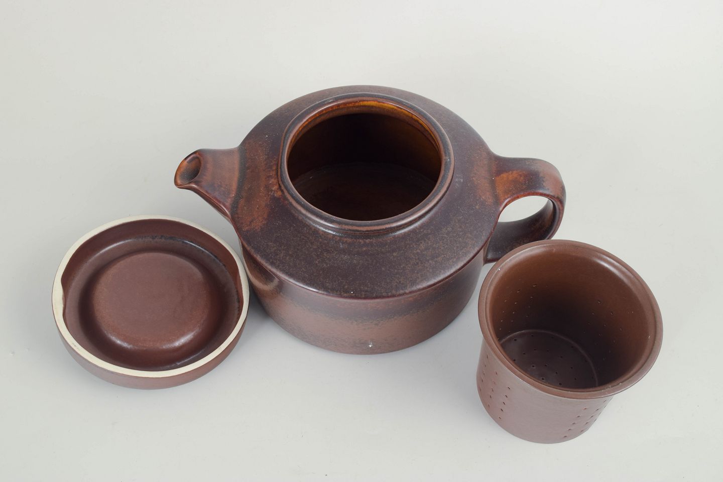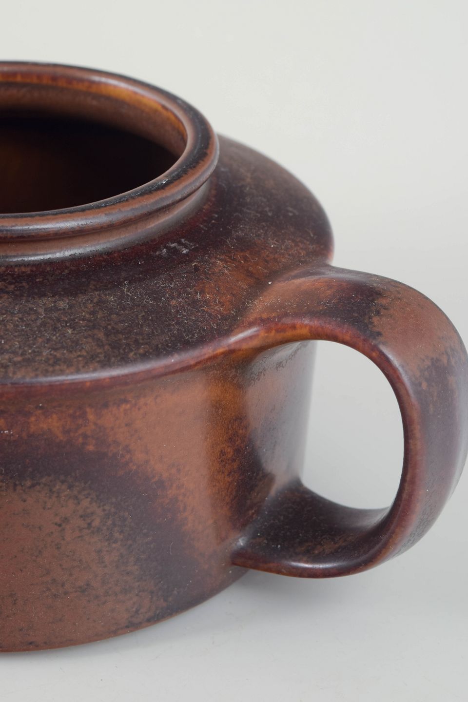 Compact stoneware teapot by Arabia from the Ruska series, finished in the distinctive mottled brown glaze in warm earth tones. Low cylindrical body with an integrated spout, broad handle and a flat lid with loop handle.