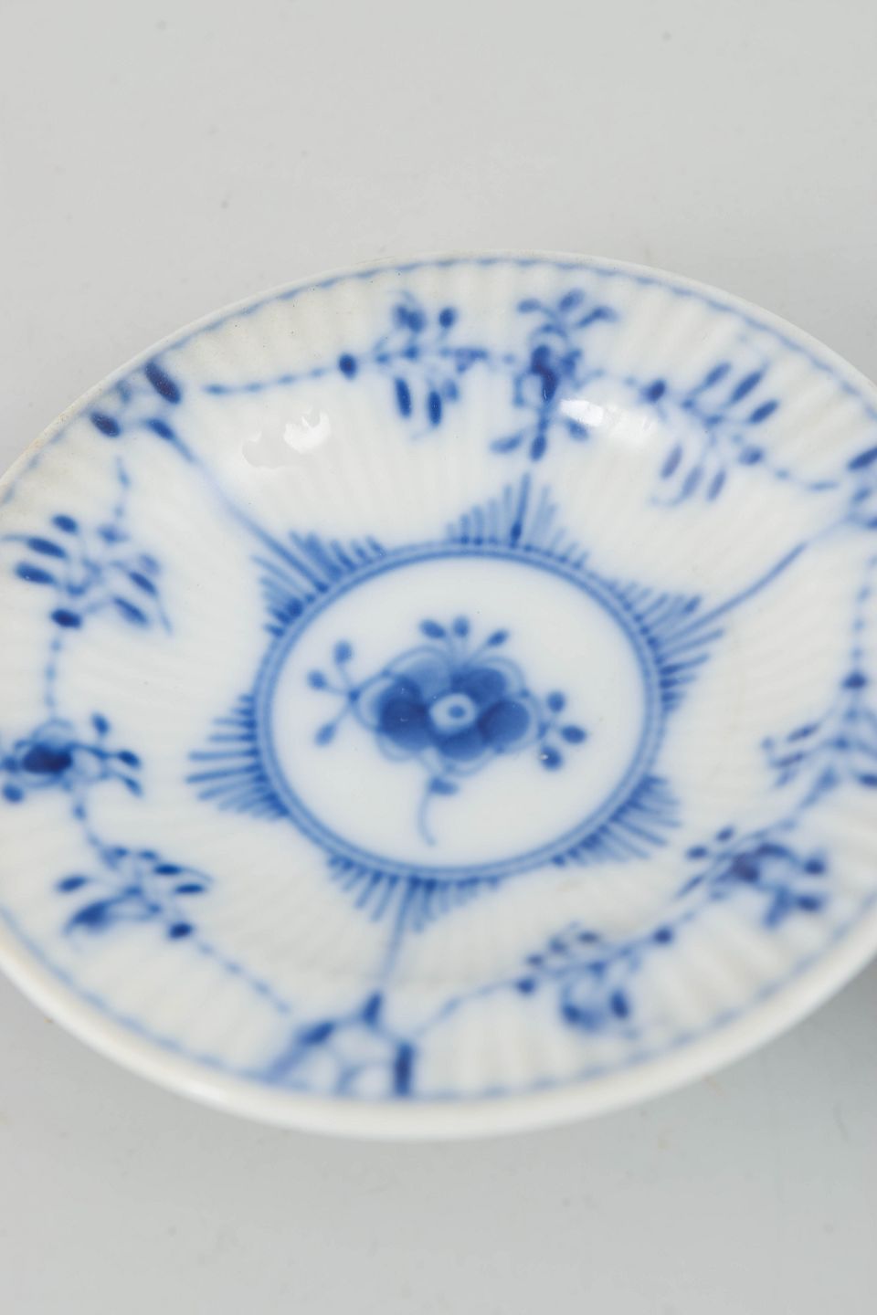Set of two small fluted dishes in glazed porcelain with hand-painted cobalt-blue underglaze decoration. Low, rounded form with a slightly raised foot. Model 1/7.
