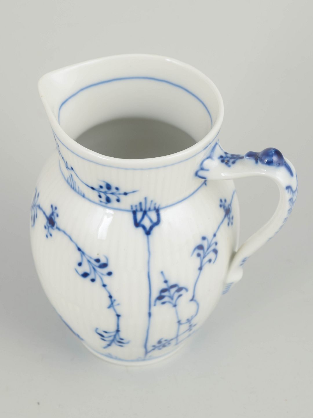 Fluted creamer in glazed porcelain with hand-painted cobalt-blue underglaze decoration. Classic baluster-shaped body with a curved spout and decorative handle. Model 1/459.