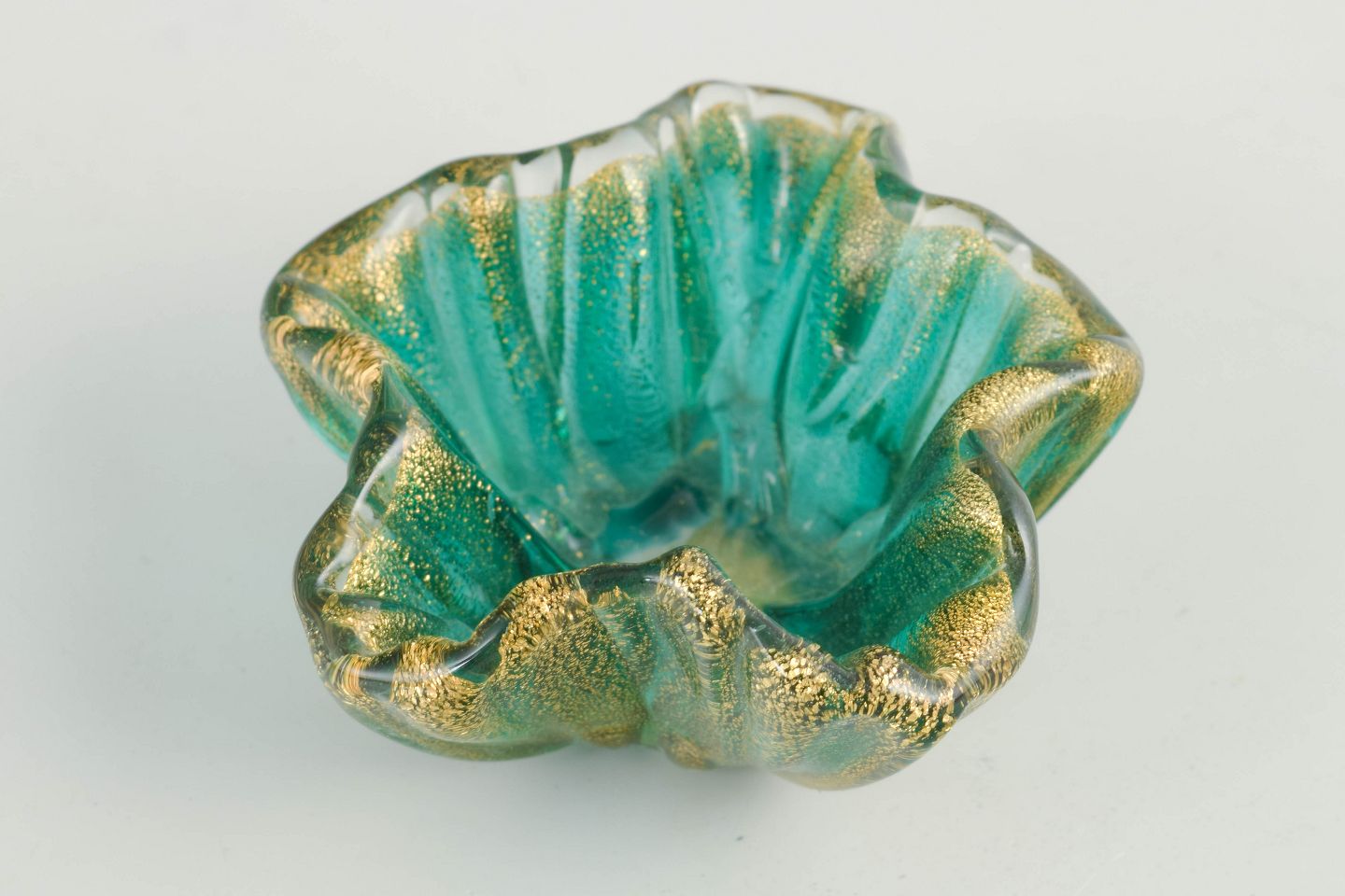 Decorative bowl in mouth-blown glass with an organic, undulating form and rich decoration in turquoise-green tones combined with golden inclusions, creating a vivid and tactile expression. The surface displays a refined interplay between transparent glass and shimmering particles, characteristic of Murano glass production in the mid-20th century. The model belongs to a tradition of small art glass bowls made as individual decorative objects.