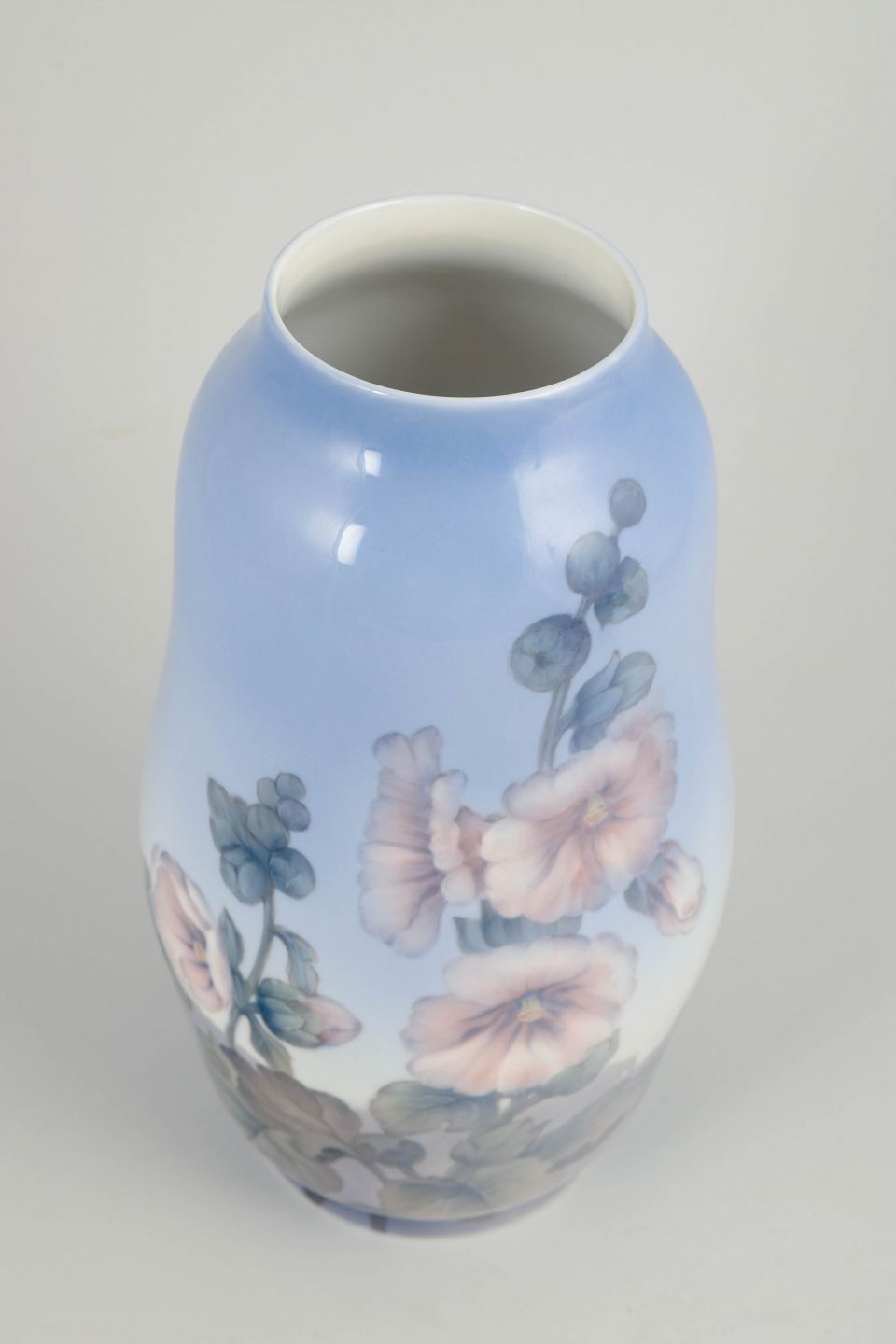 Large baluster-shaped porcelain vase with a hand-painted underglaze decoration of flowers and foliage in soft pink, green, and grey tones against a pale blue ground. The decoration is richly nuanced and well balanced with the generous proportions of the vase.