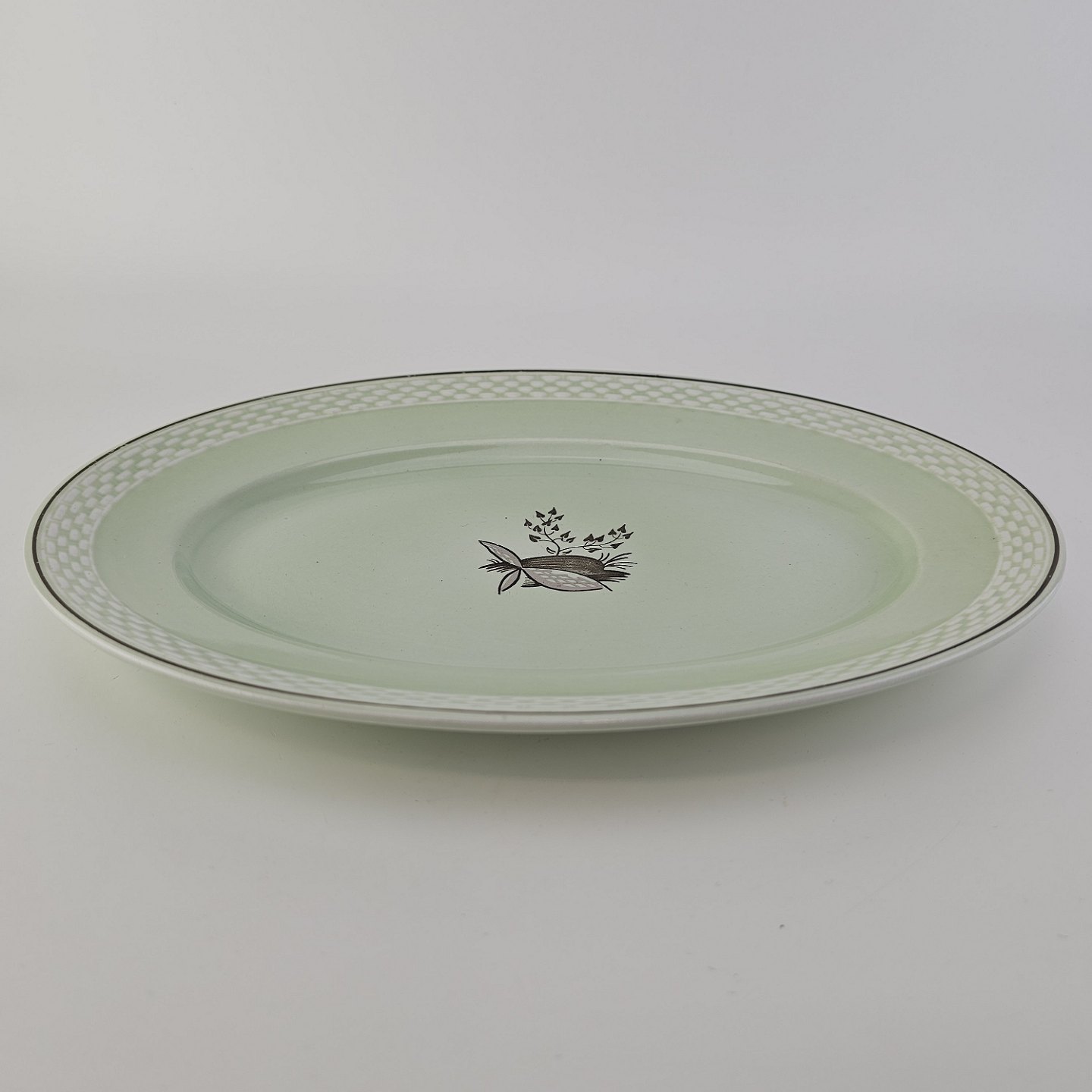 Stel i lysegrøn fajance med natur dekoration og flettet kant