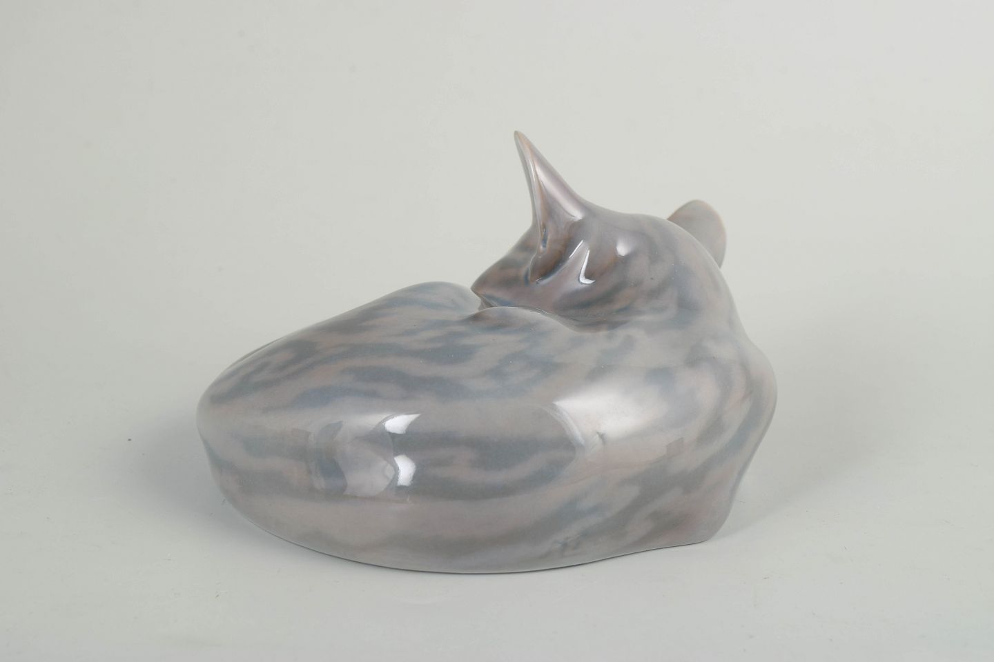 Porcelain figurine depicting a curled, sleeping cat, modelled with soft lines and finished in a subtle grey and white glaze with delicate tonal variations. Model 422.