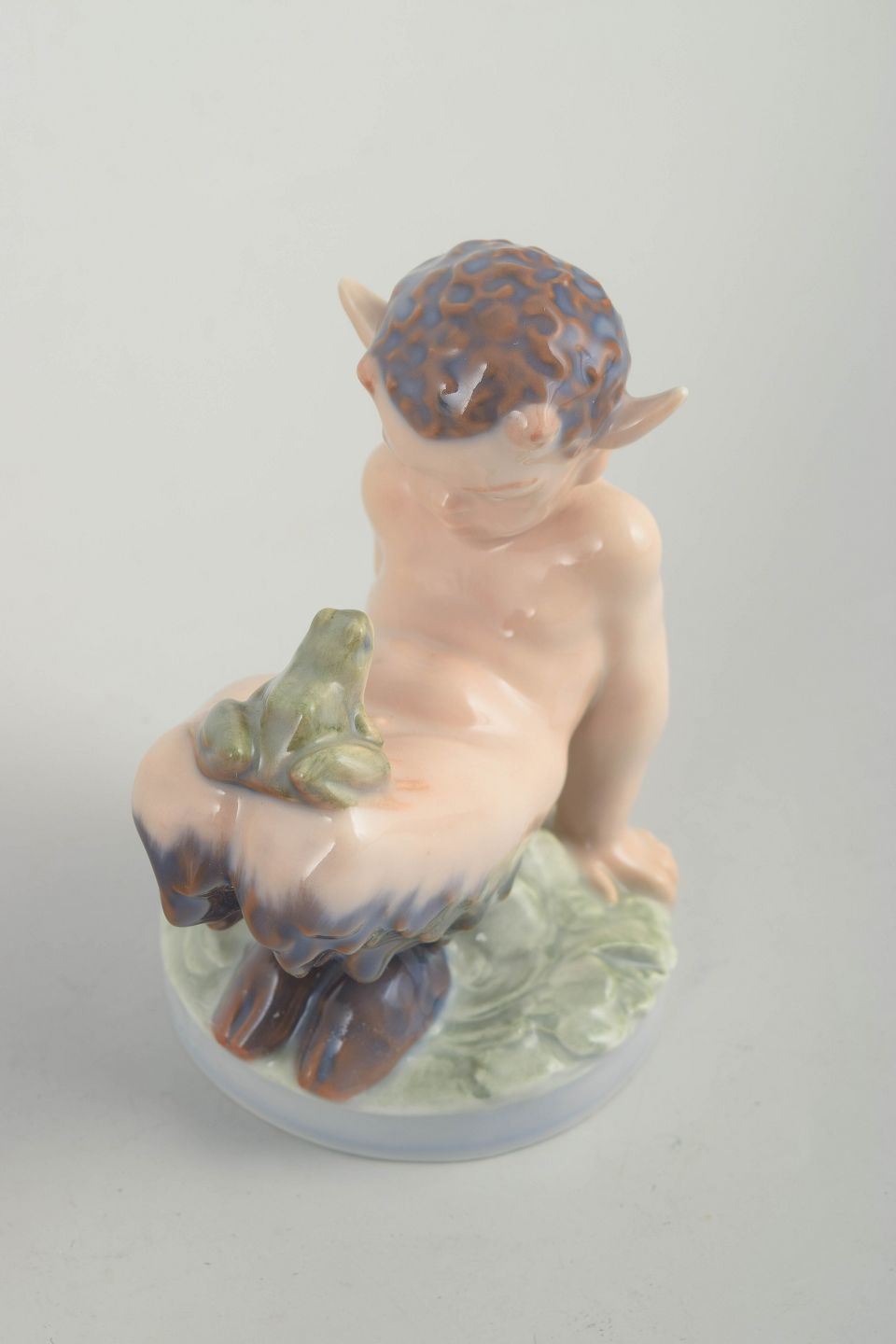 Porcelain figurine depicting a faun and frog seated on a base, modelled with soft, naturalistic forms and subtle pastel colouring. Model 1713.