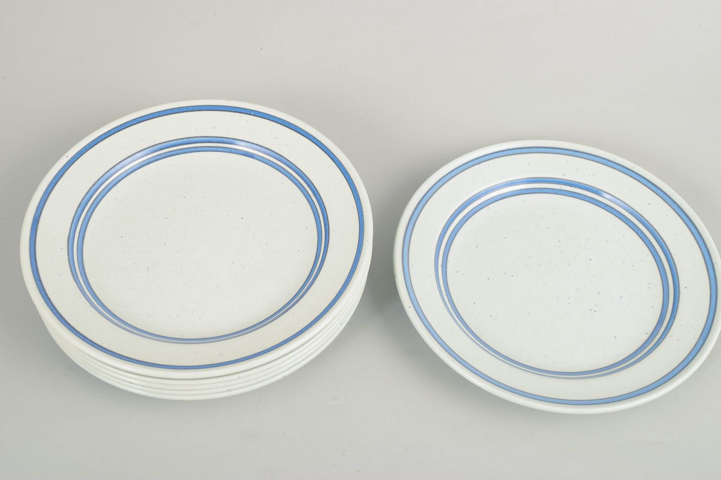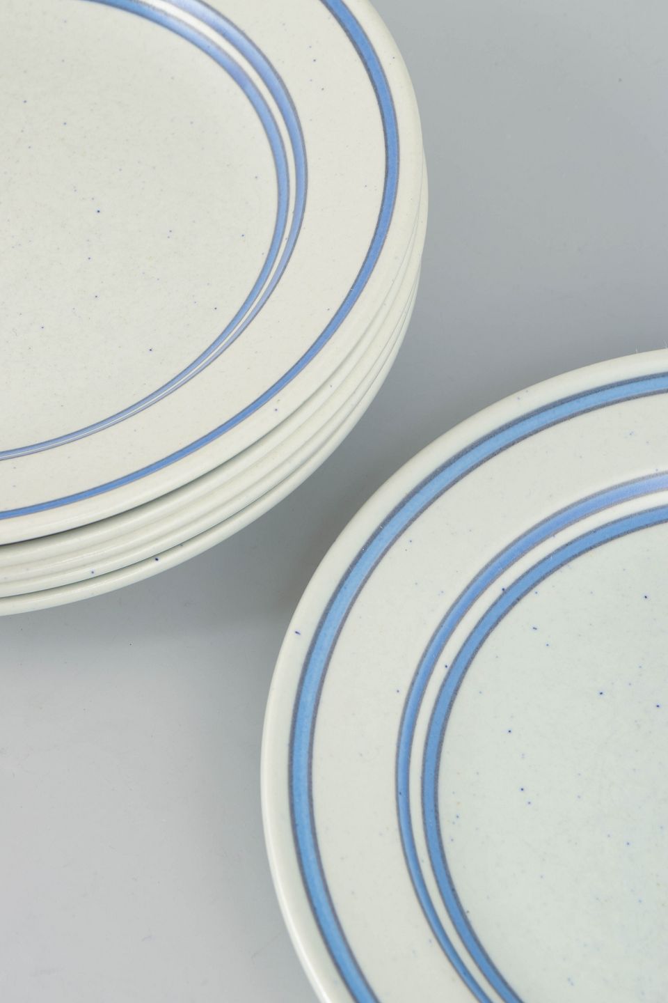 Set of salad plates in faience with a simple circular form and restrained blue line decoration on a light ground. The plates are produced as part of Gustavsberg’s “Dart” series, characterised by its clean and graphic expression, typical of Stig Lindberg’s work from this period.