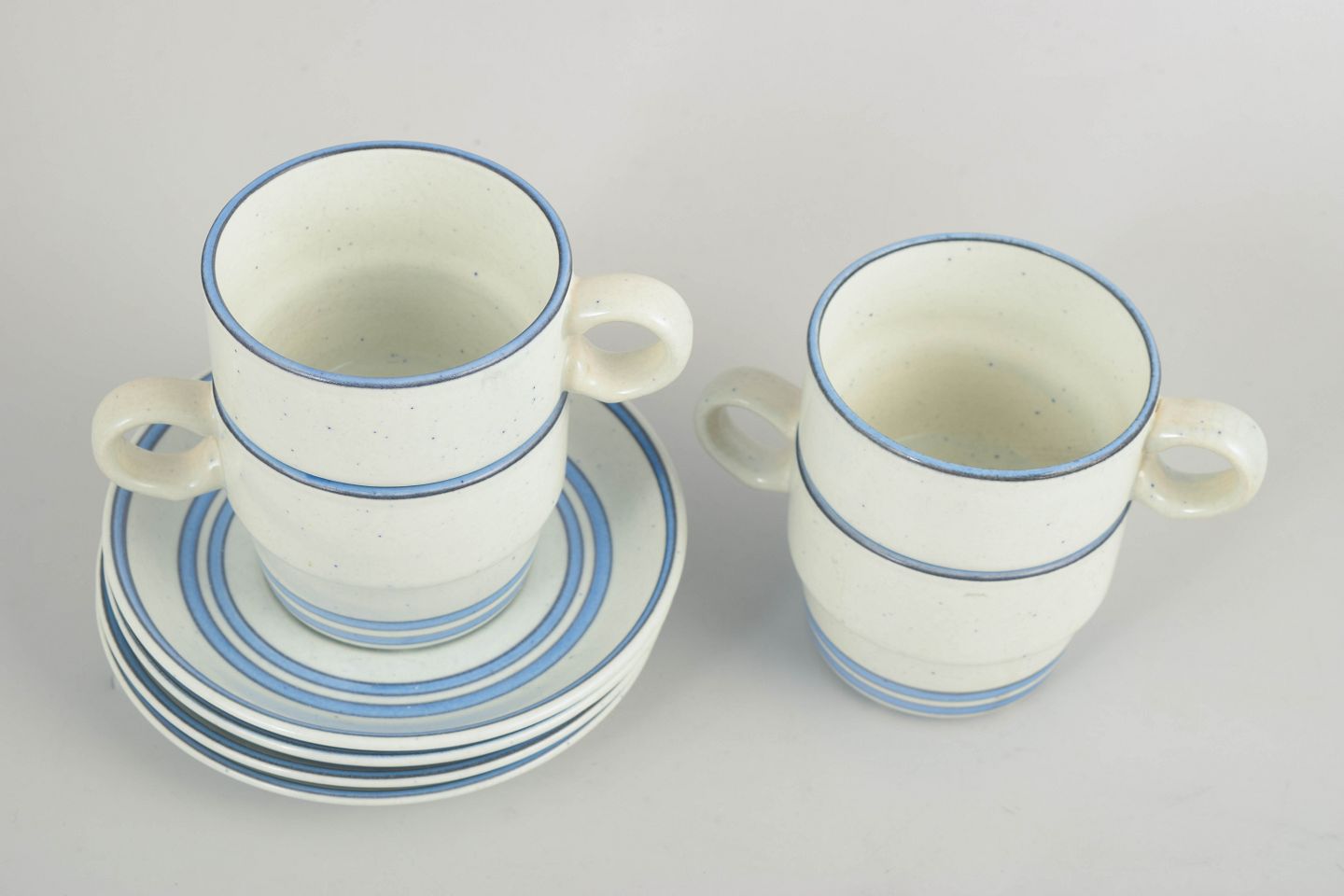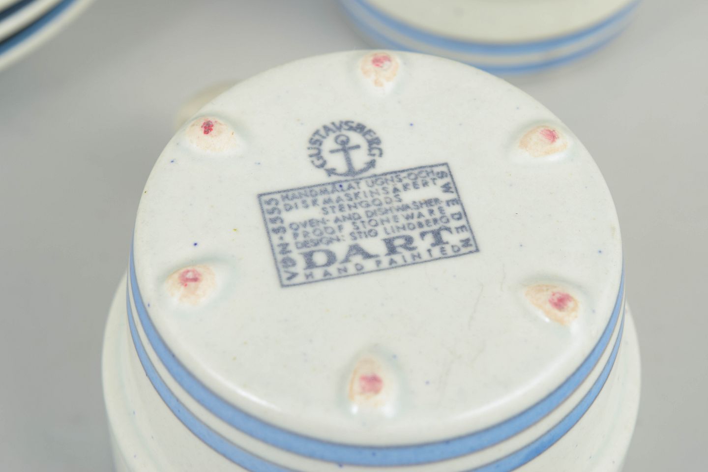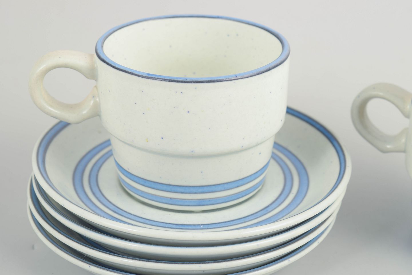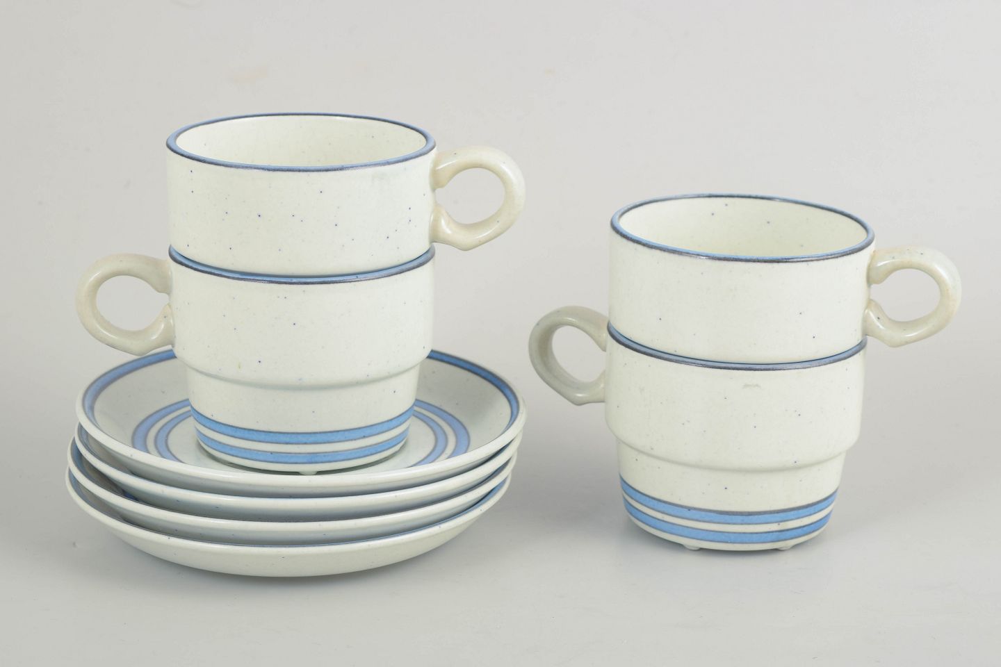 Set of four coffee cups with matching saucers in faience from the “Dart” series. Simple cylindrical forms with gently curved handles and restrained blue line decoration on a light ground, characteristic of Stig Lindberg’s functional and graphic design language of the period.