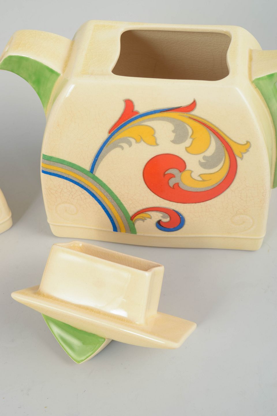 Art Deco faience teapot and sugar bowl with hand-painted decoration from the “Syren” series. Both pieces feature distinctive angular forms with green handles and lid details, combined with a dynamic, stylised floral motif in vivid colours characteristic of Clarice Cliff’s design language.