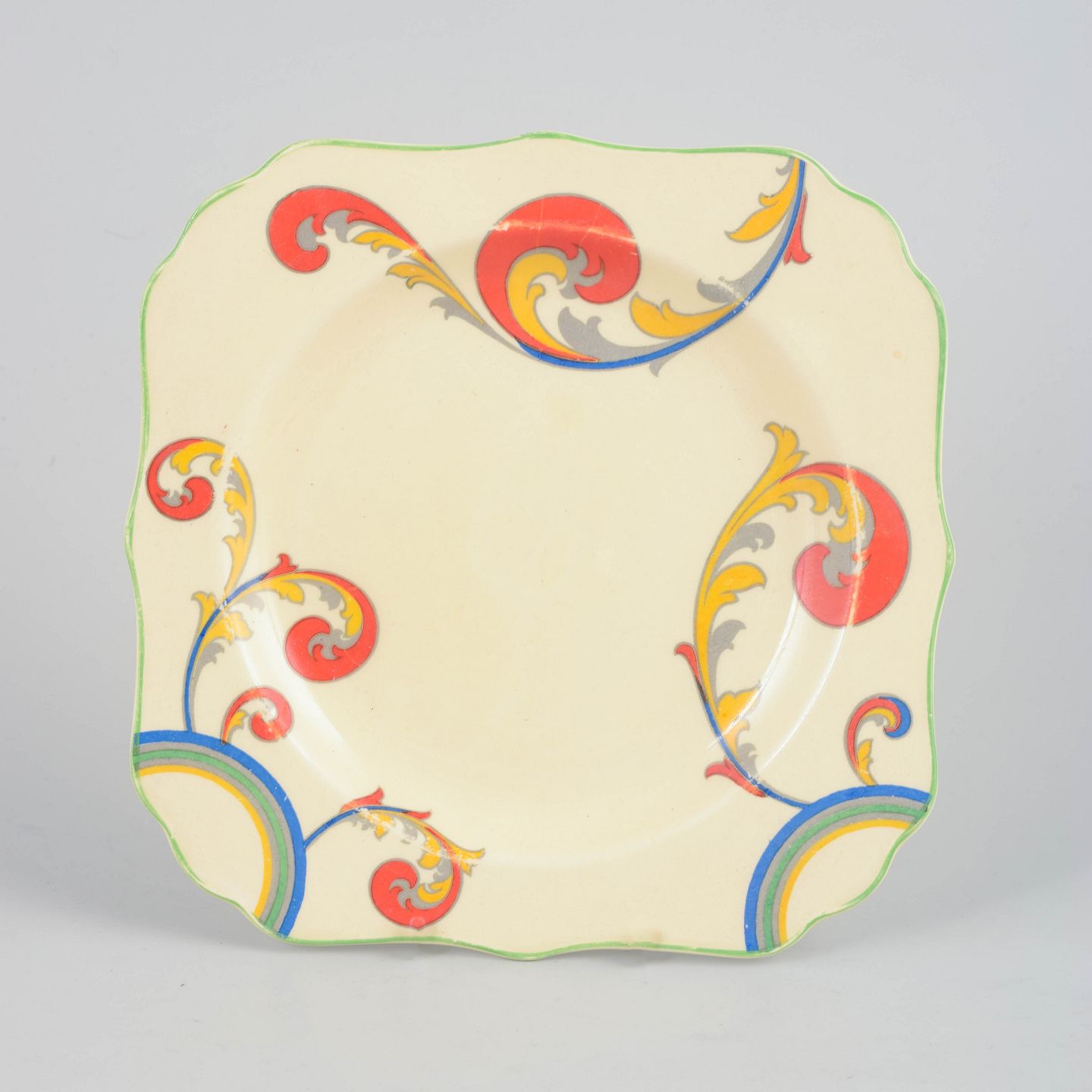 Art Deco faience dish with hand-painted decoration from the “Syren” series. The dish features a softly square form with a gently scalloped edge and a vivid, stylised floral motif in bold, contrasting colours, characteristic of Clarice Cliff’s decorative language.