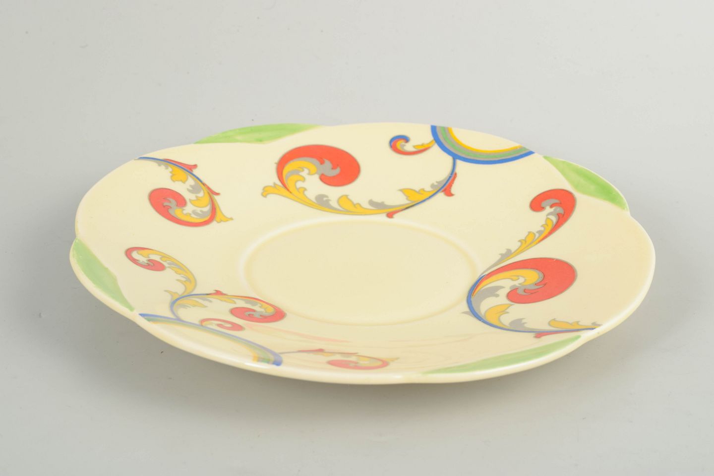 Art Deco faience serving dish with hand-painted decoration from the “Syren” series. The dish features a round form with a softly scalloped rim and a dynamic, stylised floral motif in vivid, contrasting colours, characteristic of Clarice Cliff’s interwar design language.