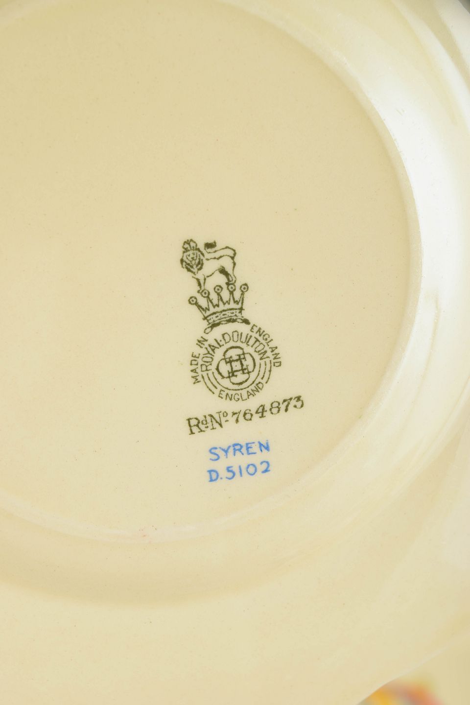 Clarice Cliff is regarded as one of the most influential figures in British Art Deco ceramics. Her work for Royal Doulton is defined by bold colour schemes, stylised natural motifs and a distinctly modern design language that set her apart from earlier, more traditional decoration. The “Syren” series exemplifies this decorative approach and is today highly sought after by collectors.