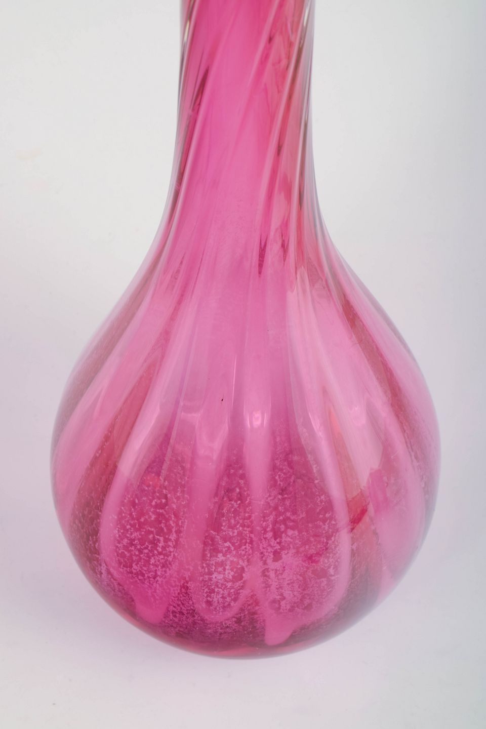 Tall, mouth-blown glass vase with a slender, elongated neck and teardrop-shaped body. Executed in transparent pink glass with elegant twisted optical ribbing and a slightly weighted base, characteristic of mid-century Murano production.