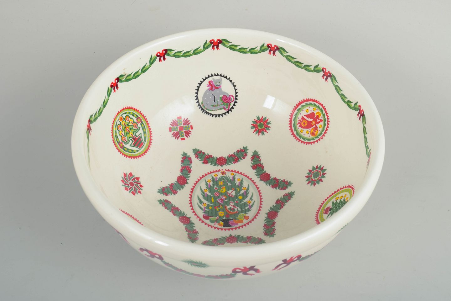 Large, round faience bowl decorated with a classic Christmas motif featuring garlands, bows and holly in red and green tones on a light ground. The bowl has a softly rounded form and displays the distinctive decorative style associated with Susan Williams-Ellis’ designs for Portmeirion.