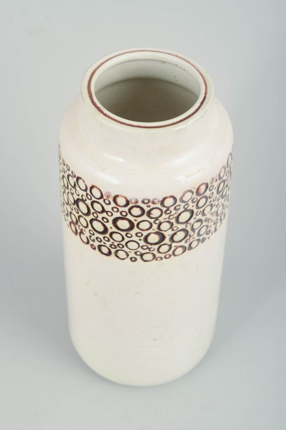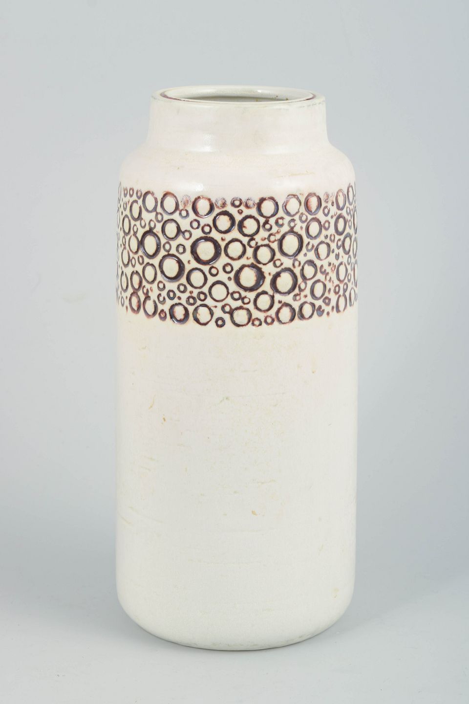 Cylindrical stoneware vase with a white glaze and a decorative band of brown circular motifs around the shoulder. A restrained, graphic design characteristic of Lisa Larson’s work for Gustavsberg in the 1970s. The model belongs to Gustavsberg’s decorative stoneware production of the period.