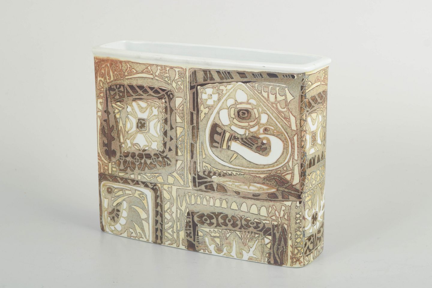 Rectangular faience vase with relief-decorated panels and characteristic geometric ornamentation in muted earth tones with lighter contrasting details. The vase is executed in Nils Thorsson’s well-known design language from the Baca series, clearly inspired by archaeological and graphic motifs. The surface has a pronounced tactile quality, with decoration integrated into the form to create a balanced and cohesive expression. Produced by Royal Copenhagen in the 1970s. Model 719/2942.