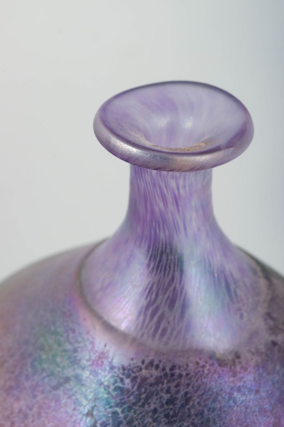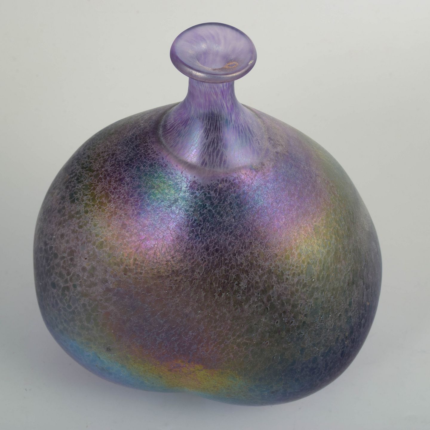 Sculptural, baluster-shaped art glass vase in mouth-blown glass with a characteristic iridescent surface in shades of violet, blue and green. The surface features a lively, subtly crackled texture that creates depth and colour variation. Produced after Kosta Boda model 48138 and representative of Bertil Vallien’s experimental approach during the 1980s.