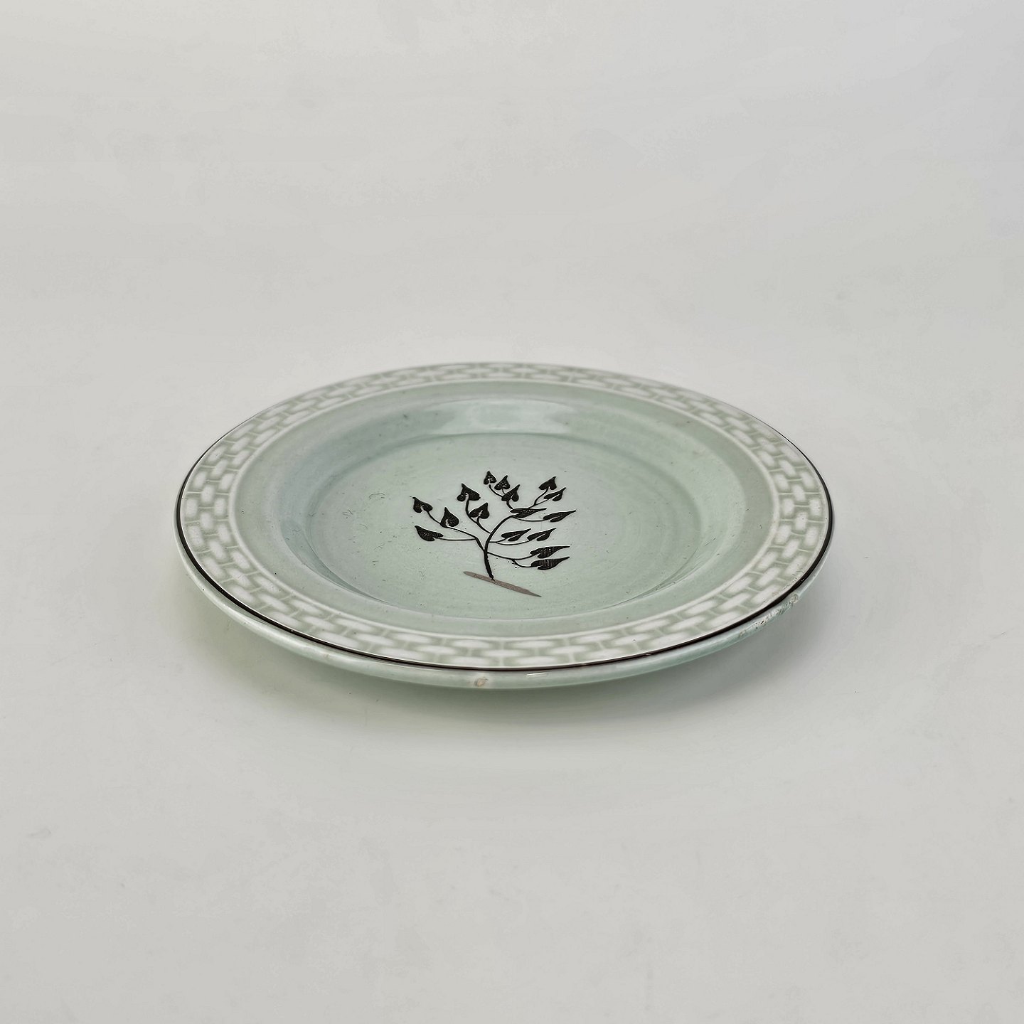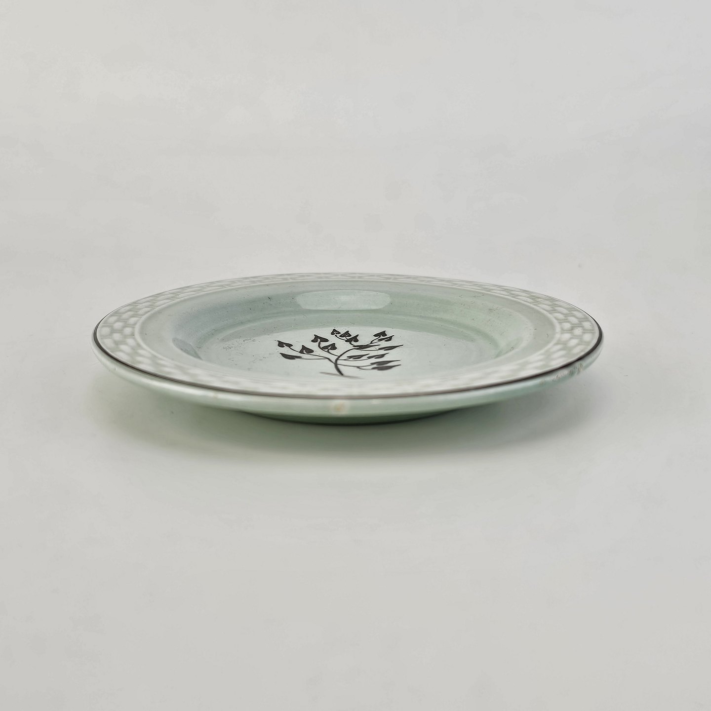 Stel i lysegrøn fajance med natur dekoration og flettet kant
