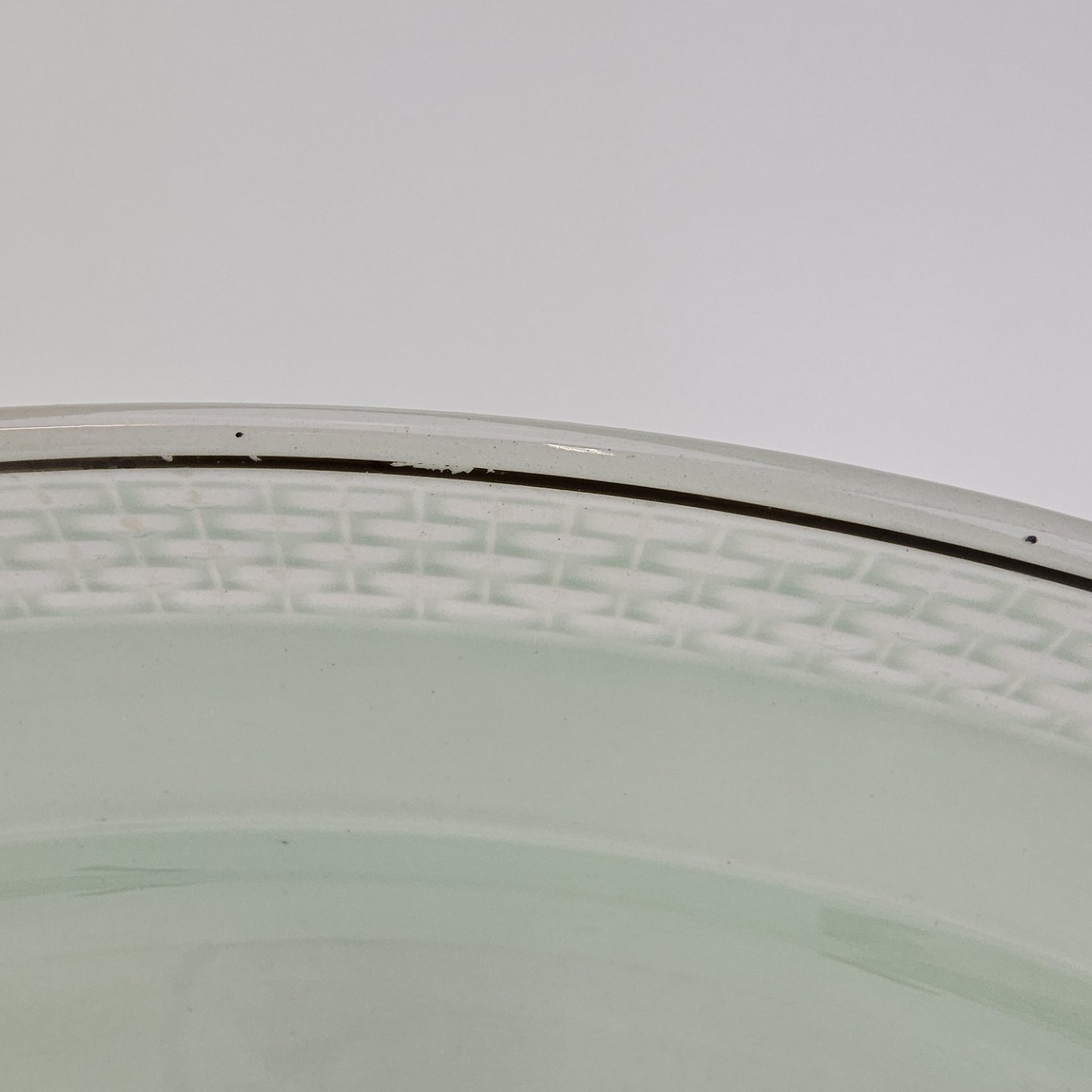 Stel i lysegrøn fajance med natur dekoration og flettet kant
