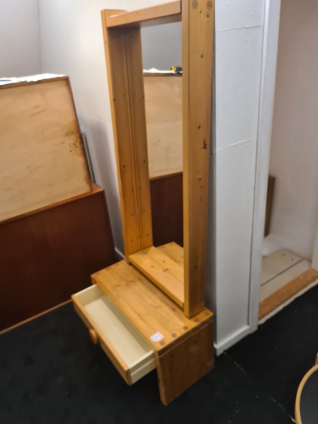 Text available in Danish: Svensk produceret entré møblement bestående af kommode og spejl. Fremstillet i massiv fyr i 1980'erne. Fremstår godt og ok velholdt dog med lidt overfladiske brugsspor.