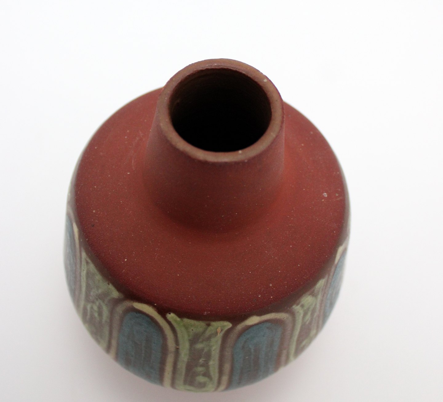 Text available in Danish: Johannes Andersen eget værksted. Vase fra 1950'erne. Rødbrun ru og mat glasur med bånd af grøn og blå glasur. Nr. 304. Signeret JA DANMARK. Højde 14 cm. Største diameter 10 cm. God stand, dog med en krakelering i båndet og så hvide prikker i den røde glasur. Pris: 250 kr.