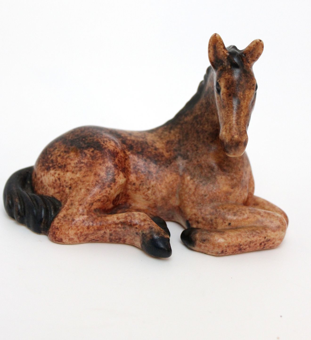 Michael Andersen, Bornholm, Lille liggende føl i brun glasur. Stempel + det gamle klistermærke. Længde 12 cm. Højde 8 cm. Flot stand. Pris: 450 kr.
