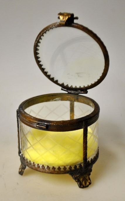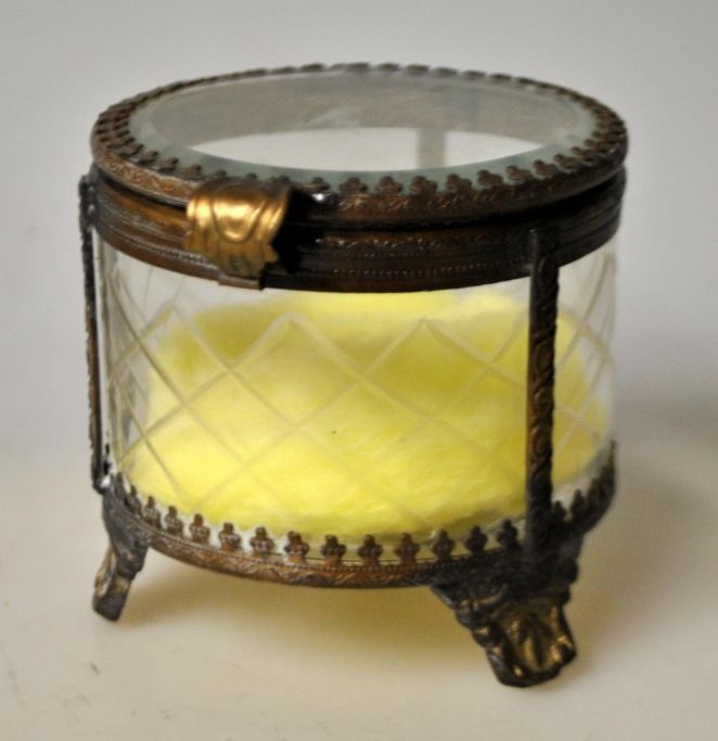 Jewelry box, France, circa 1900. With faceted glass and decorated brass frame and three legs. H.: 8 cm. Dia.: 8 cm.