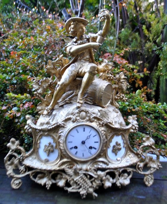 Bronzed zinc clock, c. 1870, France. Main figure of a young man sitting on top of a barrel with a mug. The entire clock is decorated with vine leaves and grapes. White enamel dial with Roman numerals. Dial signed: J. A, Hansen, Odense. H. 45 cm. W.: 42 cm. D.: 12 cm.