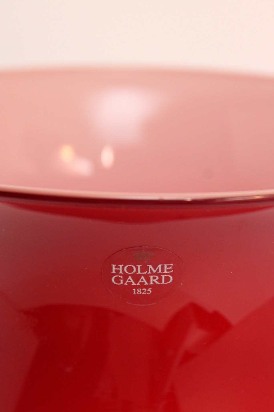 Text available in Danish: Holmegaard, Karen Blixen, Stor bordeaux rød vase støvet rosa indvendig. Designet af Anja Kjær fra 2000. Vasens form er inspireret af afrikanske kvinders hals og armringe. Højde 31 cm. Diameter 17 cm. Holmegaard label. Fin stand. Pris: 550 kr. stk. Lager: 1