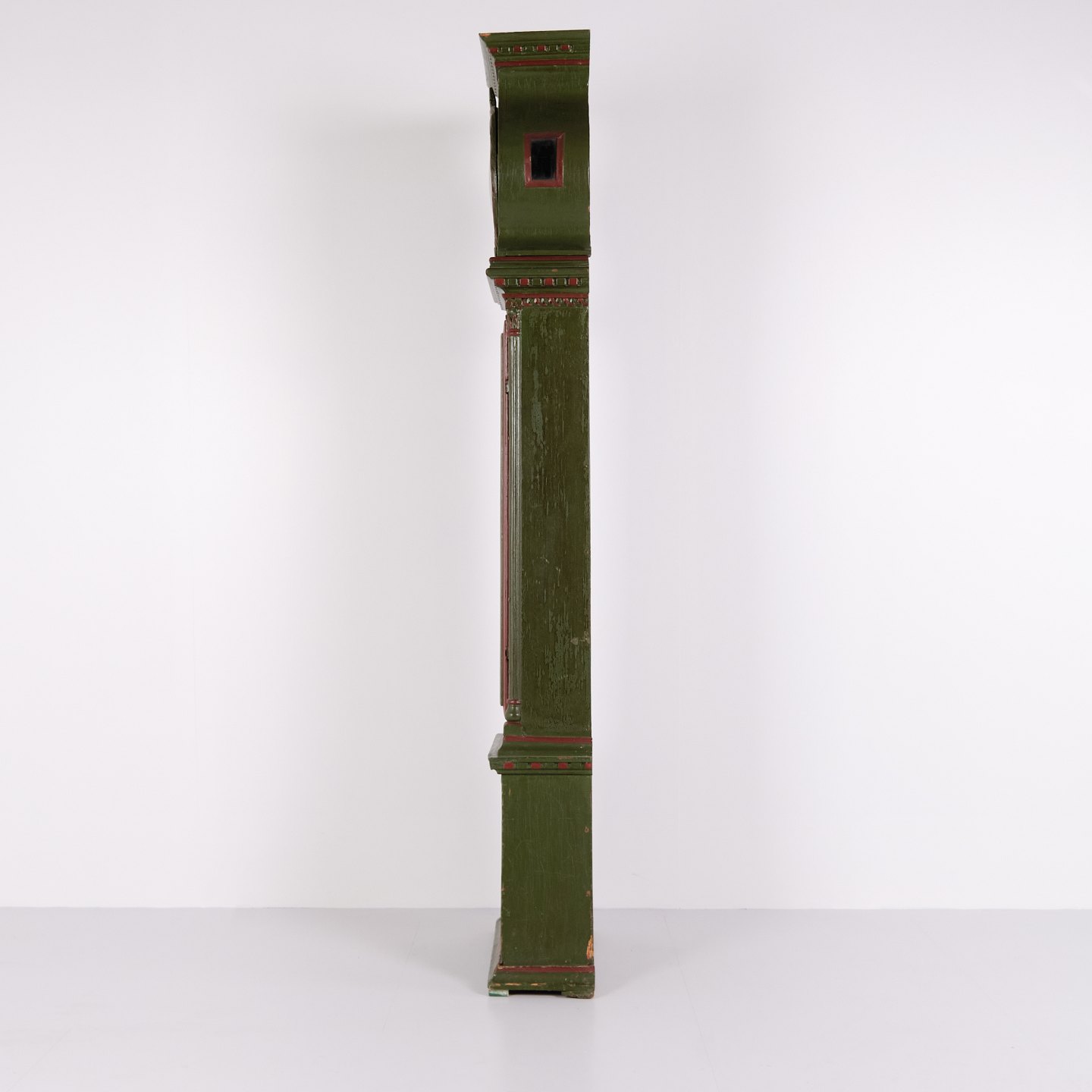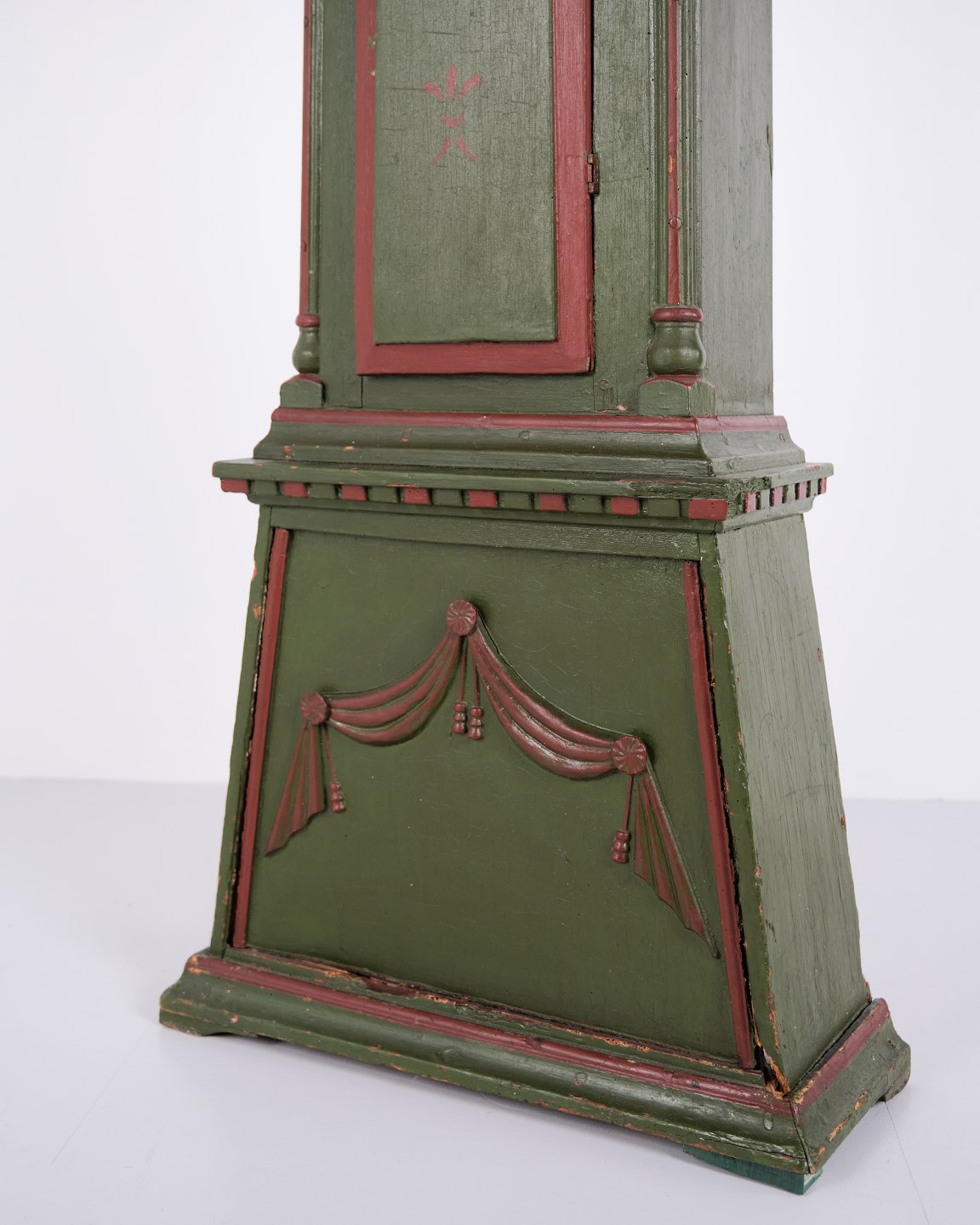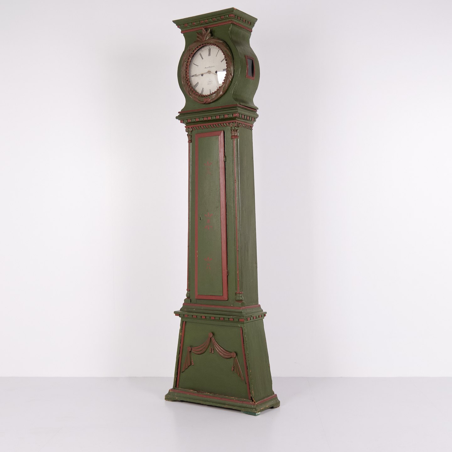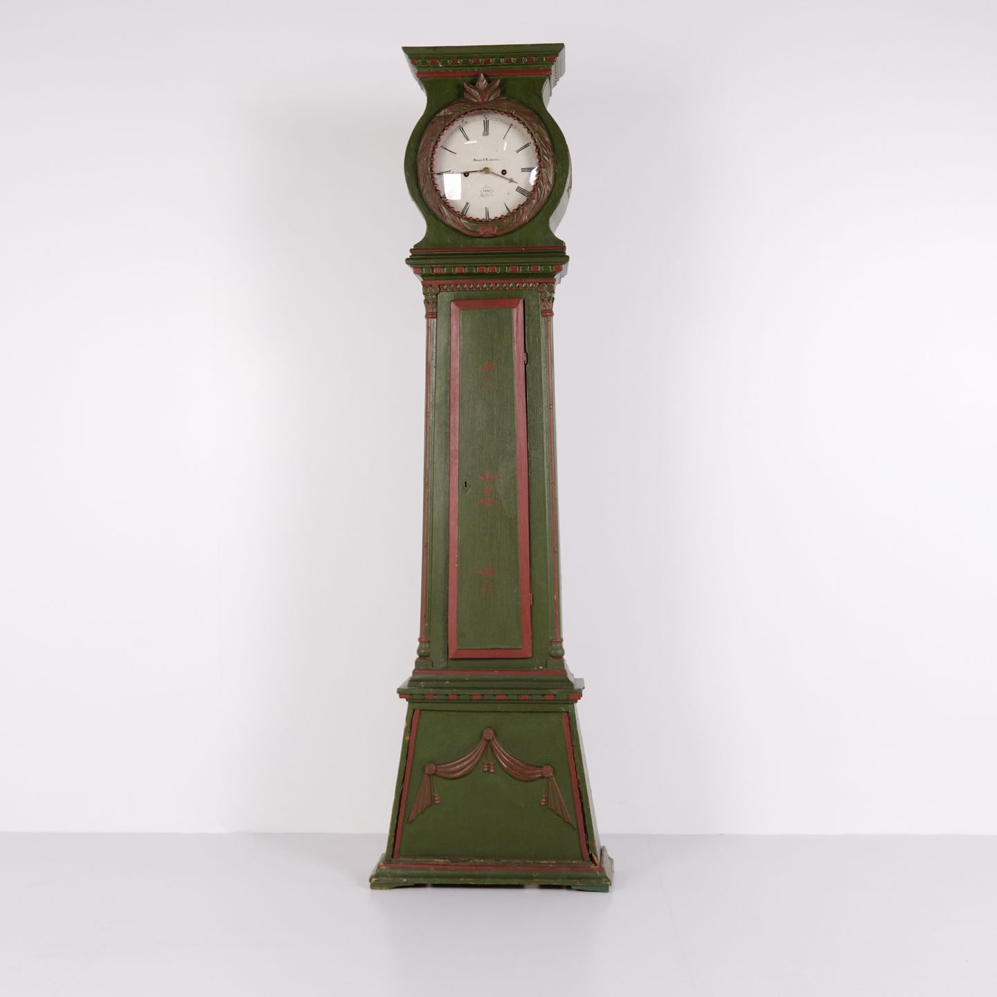 Bornholm Longcase Clock – “Frøken” Model – Hand-Painted With Carved Details – Green & Red Paint – 1860s