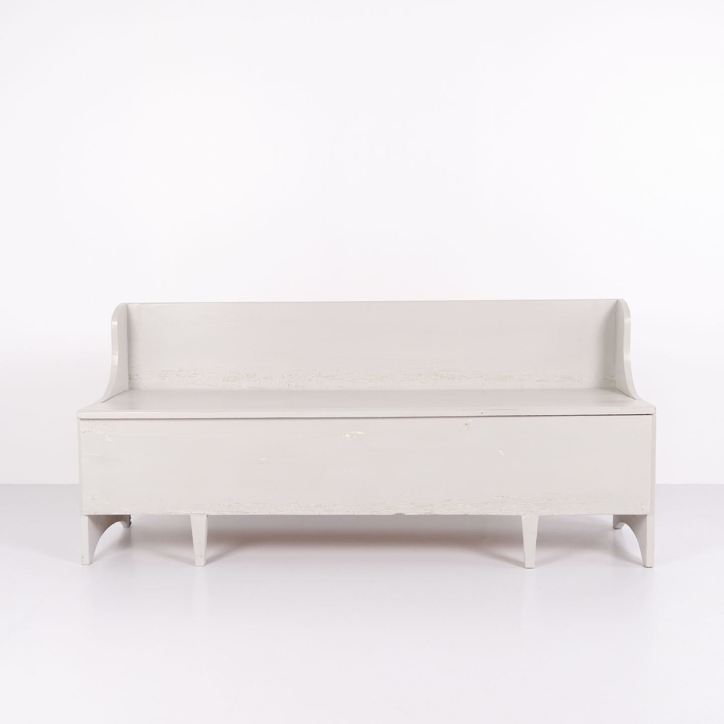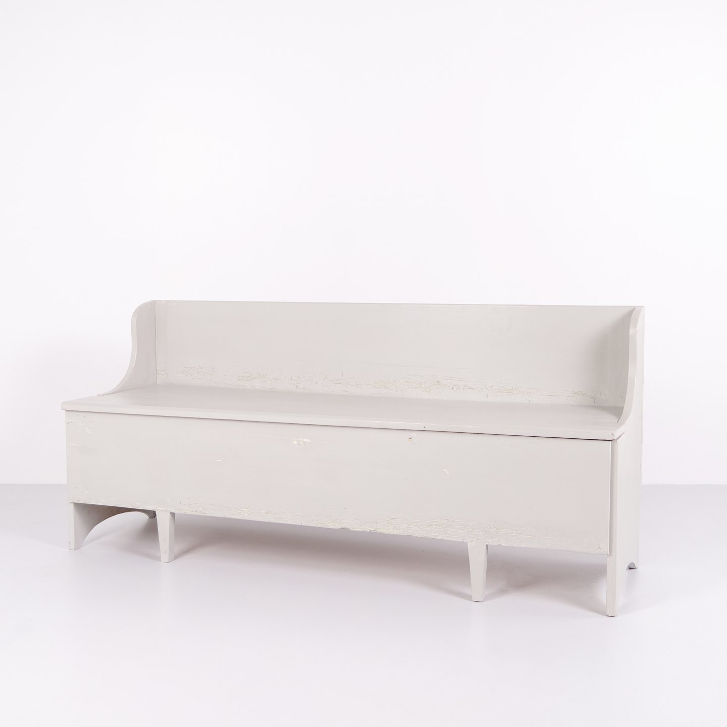 Antique storage bench from the 1890s in grey-painted pine wood. Antique storage bench from the 19th century.