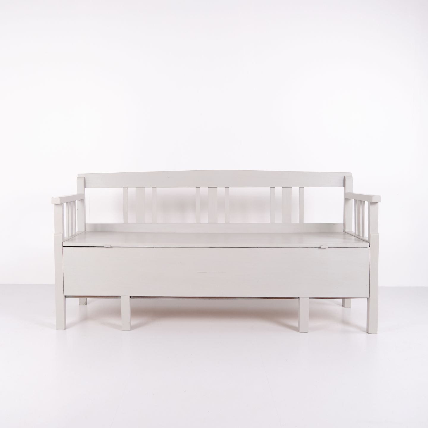 Antique storage bench from the 1860s in grey-painted pine wood. Antique storage bench from the 19th century.
