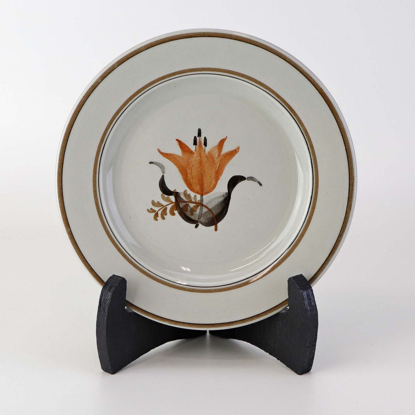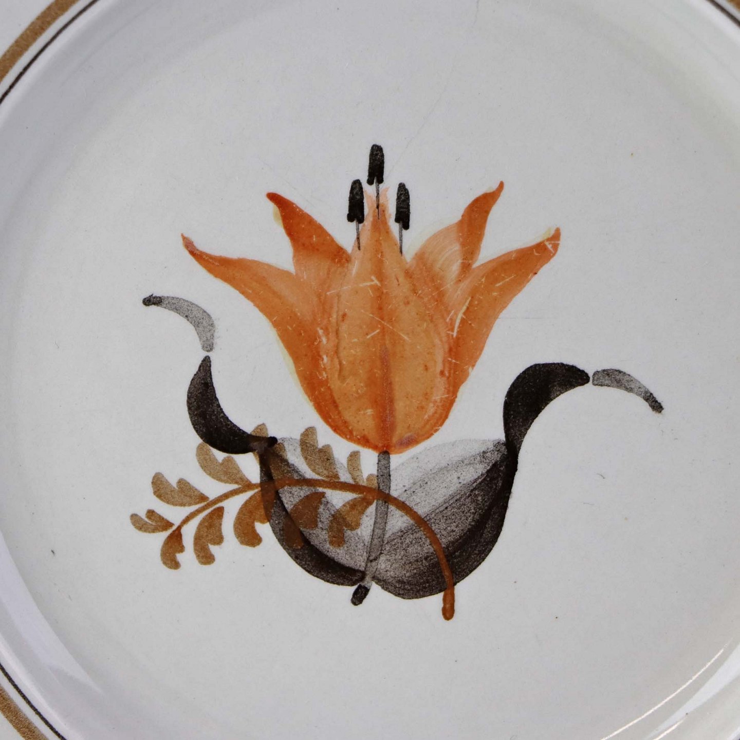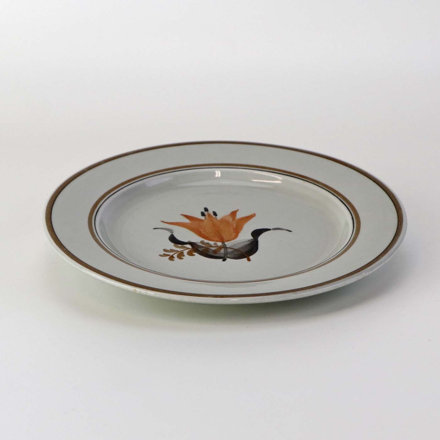 Fremstår med brugsspor på dekorationen og misfavning i glasuren på bagsiden.