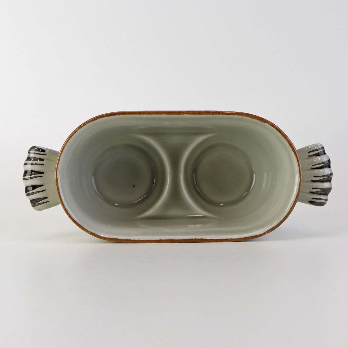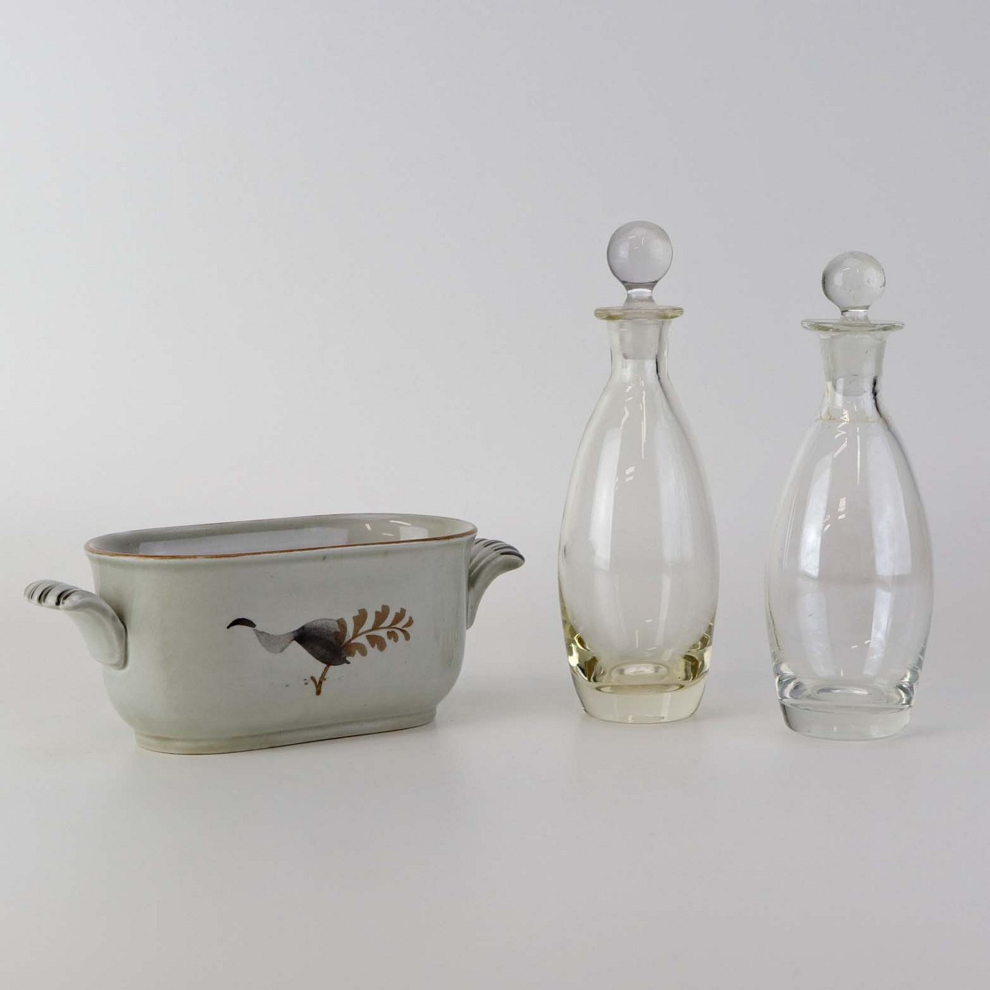 Text available in Danish: Sæt med to glasflasker til olie og eddike med prop i kar med hanke af fajance fra stellet Kirsten, som blev fremstillet i perioden 1934-1957.