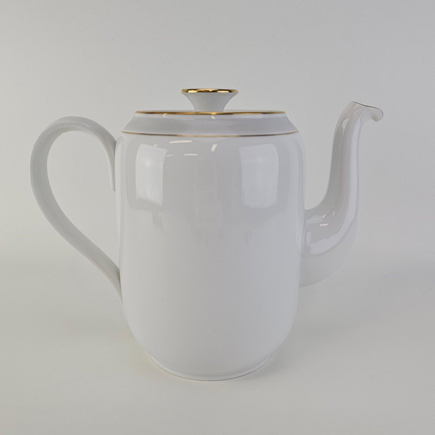 Tiber er stel i glat hvidt porcelæn med grå bort og guldkant
