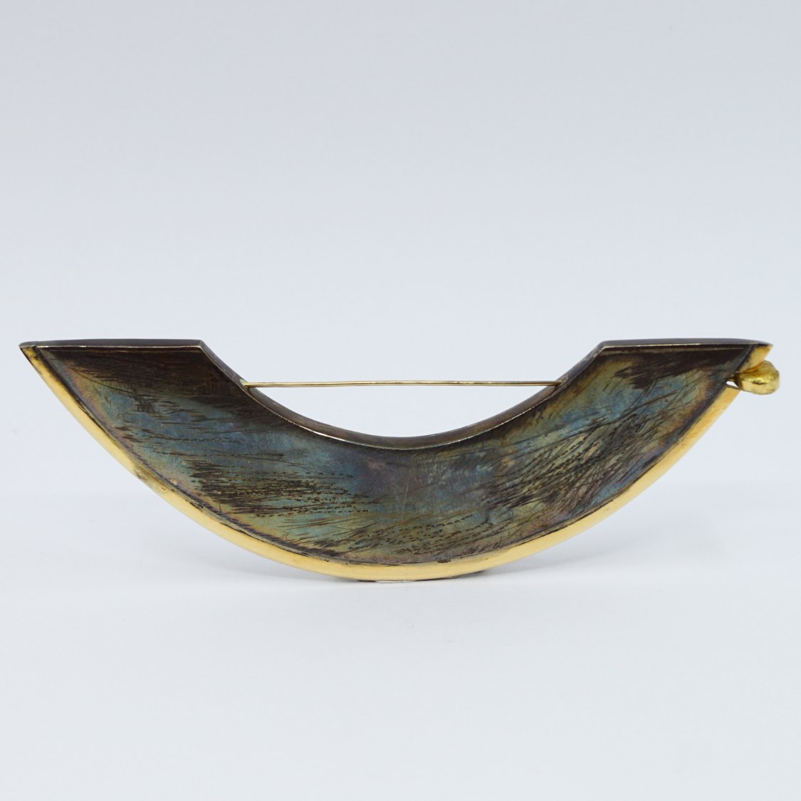 Anette Kræn; Large silver brooch with oxidized surface and 14k gold. Can be turned in two different ways, each with its own expression.