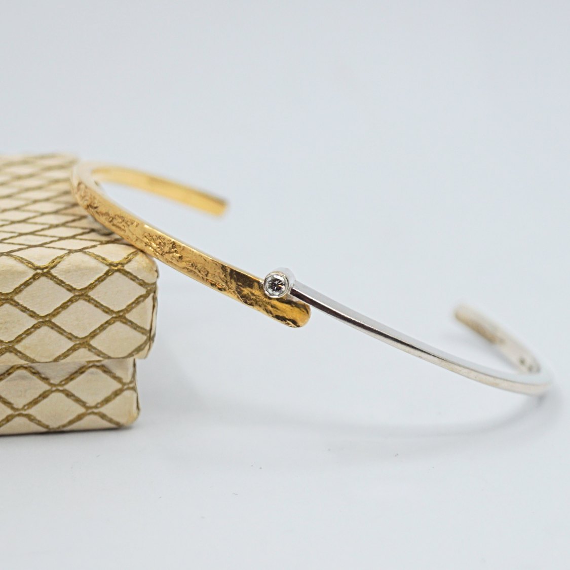 Gold bangle in 14k gold and white gold, set with a diamond mounted in white gold.