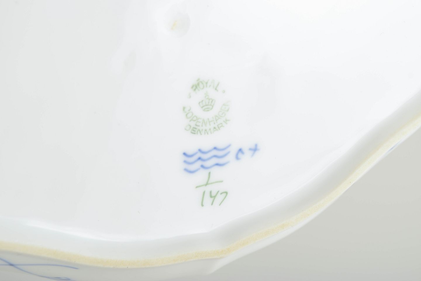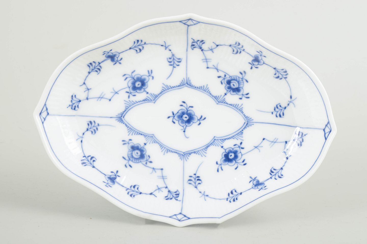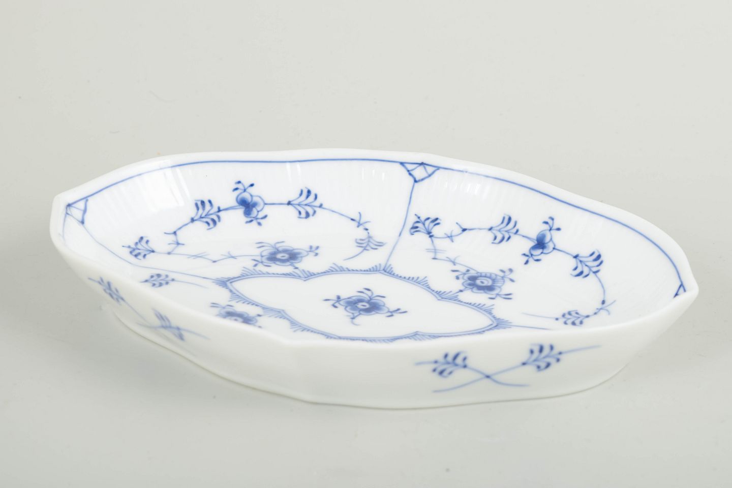 Oval porcelain dish decorated with hand-painted cobalt blue underglaze in the classic Blue Fluted Plain pattern. Model 1/147. The softly faceted, gently contoured shape with a moulded rim and segmented well is richly adorned with floral and scrolling motifs, exemplifying Royal Copenhagen’s refined craftsmanship of the interwar period.