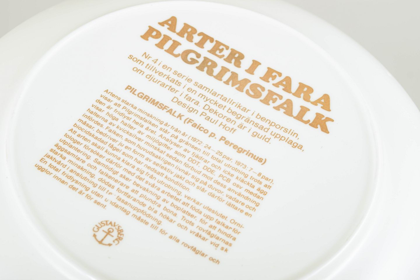During the 1980s, Gustavsberg introduced the “Arter i fara” series to highlight endangered species through decorative collector’s plates. The series is characterised by precise graphic wildlife imagery combined with informative text, and its relatively limited production has made it sought after among collectors of Swedish porcelain.