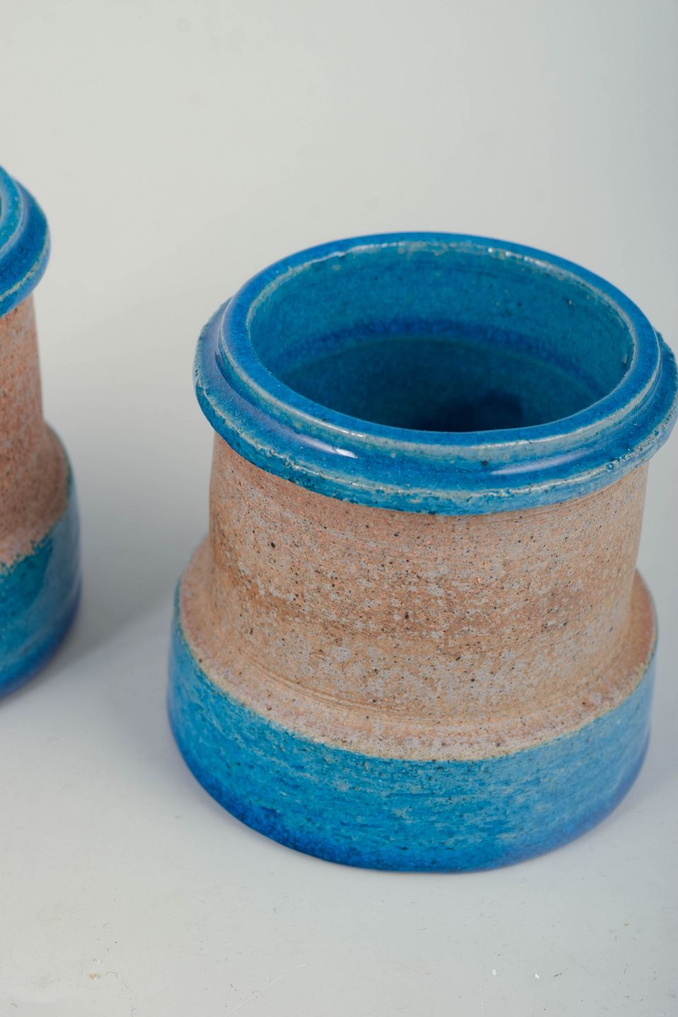 Pair of small cylindrical vases in thrown stoneware with a glossy blue glaze at the base and rim, combined with a sand-coloured unglazed central section. Simple, functional forms characteristic of Danish modernism from the 1960s.